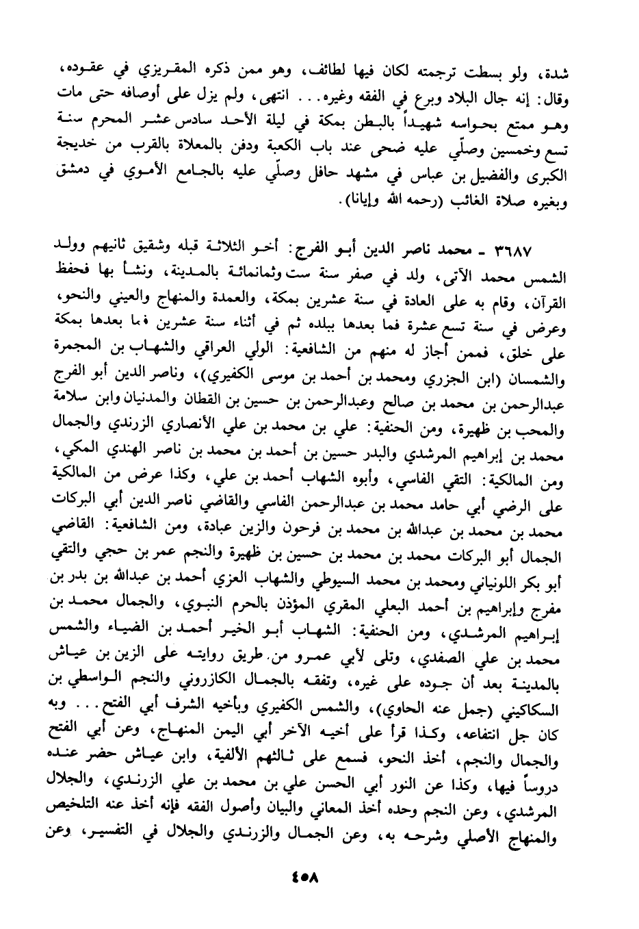 3687 - محمد ناصر الدين أبو الفرج: أخو الثلاثة قبله وشقيق ثانيهم وولد الشمس محمد الآتي ولد في صفر سنة ست وثمانمائة بالمدينة ونشأ بها فحفظ القرآن وقام به على العادة في سنة عشرين بمكة والعمدة والمنهاج والعيني والنحو وعرض في سنة تسع عشرة فما بعدها ببلده ثم في أثناء سنة عشرين فما بعدها بمكة على خلق فممن أجاز له منهم من الشافعية الولي العراقي والشهاب بن المجمرة والشمسان "ابن الجزري ومحمد بن أحمد بن موسى الكفيري" وناصر الدين أبو الفرج عبد الرحمن بن محمد بن صالح وعبد الرحمن بن حسين بن القطان والمدنيان وابن سلامة والمحب بن ظهيرة ومن الحنفية: علي بن محمد بن علي الأنصاري الزرندي والجمال محمد بن إبراهيم المرشدي والبدر حسين بن أحمد بن محمد بن ناصر الهندي المكي ومن المالكية: التقي الفاسي وابوه الشهاب أحمد بن علي وكذا عرض من المالكية على الرضي أبي حامد محمد بن عبد الرحمن الفاسي والقاضي ناصر الدين أبي البركات محمد بن محمد بن عبد الله بن محمد بن فرحون والزين عبادة ومن الشافعية: القاضي الجمال أبو البركات محمد بن محمد بن حسين بن ظهيرة والنجم عمر بن حجي والتقي أبو بكر اللونياني ومحمد بن محمد السيوطي والشهاب العزي أحمد بن عبد الله بن بدر بن مفرج وإبراهيم بن أحمد البعلي المقري المؤذن بالحرم النبوي والجمال محمد بن إبراهيم المرشدي ومن الحنفية الشهاب أبو الخير أحمد بن الضياء والشمس محمد بن علي الصفدي وتلى لأبي عمرو من طريق روايته على الزين بن عياش بالمدينة بعد أن جوده على غيره وتفقه بالجمال الكازروني والنجم الواسطي بن السكاكيني "جمل عنه الحاوي" والشمس الكفيري وبأخيه الشرف أبي الفتح وبه كان جل انتفاعه وكذا قرأ على أخيه الآخر أبي اليمن المنهاج وعن أبي الفتح والجمال والنجم أخذ النحو فسمع على ثالثهم الألفية وابن عياش حضر عنده دروسا فيها وكذا عن النور أبي الحسن علي بن محمد بن علي الزرندي والجلال المرشدي وعن النجم وحده أخذ المعاني والبيان وأصول الفقه فإنه أخذ عنه التلخيص والمنهاج الأصلي وشرحه به وعن الجمال والزرندي والجلال في التفسير وعن
