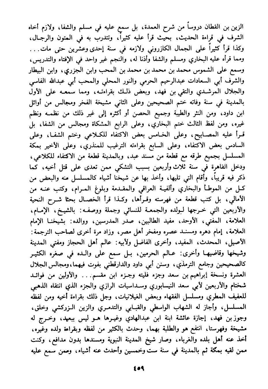 الزين بن القطان دروسا من شرح العمدة بل سمع عليه في مسلم والشفا ولازم أخاه الشرف في قراءة الحديث بحيث قرأ عليه كثيرا وتتدرب به في المتون والرجال وكذا قرأ كثيرا على الجمال الكازروني ولازمه في سنة إحدى وعشرين حتى مات ومما قرأه عليه البخاري ومسلم والشفا وأذنا له والنجم غير واحد في الإفتاء والتدريس وسمع على الشموس محمد بن محمد بن محمد بن المحب وابن الجزري وابن البيطار والشرف أبي السعادات عبد الرحيم الحرمي والنور المحلي والمحب أبي عبد الله الفاسي والجلال المرشدي والتقي بن فهد وبعض ذلك بقراءته ومما سمعه على الأول بالمدينة في سنة وفاته ختم الصحيحين وعلى الثاني مشيخة الفخر ومجالس من أوائل ابن داود ومن النثر والطيبة وجميع الحصن أو أكثره إلى غير ذلك من نظمه ونظم غيره ومن لفظ الثالث ختم البخاري وعلى الرابع المشكاة ومجالس من الشفا بل قرأ عليه المصابيح وعلى الخامس بعض الاكتفاء للكلاعي وختم الشفا وعلى السادس بعض الاكتفاء وعلى السابع بقراءته الترغيب للمنذري وعلى الأخير بمكة المسلسل بجميع طرقه مع قطعة من مسند عبد وبالمدينة قطعة من الاكتفاء للكلاعي ودخل القاهرة في سنة ثلاث وأربعين بسبب التشكي ممن تعدى على قتل أخيه كما ذكر فيه قريبا وأقام التي تليها وأخذ بها عن شيخنا أشياء كالمسلسل منه والبعض من كل من الموطأ والبخاري وألفية العراقي والمقدمة وبلوغ المرام وكتب عنه من الأمالي بل كتب قطعة من فهرسته وقرأها وكذا قرأ الخصال بحثا شرح النحية والأربعين التي خرجها لولده والجمعة للنسائي وجملة ووصفه: بالشيخ الإمام العلامة المفتي الأوحد مفيد الطالبين صدر المدرسين ووالده: بشيخنا الإمام العلامة إمام دهره ومسند عصره ومفخر أهل مصر وزاد مرة أخرى لصاحب الترجمة: الأصيل المحدث المفيد وأخرى الفاضل ولأبيه: عالم أهل الحجاز ومفتي المدينة وشيخها وقاضيها وأخرى: عالم الحرمين بل سمع على والده في صغره الكثير كالصحيحين وجامع الترمذي وسنن أبي داود والدارقطني بفوت فيهما ومجالس الجلال العشرة ونسخة إبراهيم بن سعد وجزء فليته وجزء ابن مقسم والأولين من فوائد شختام والأربعين لأبي سعد النيسابوري وسداسيات الرازي والجزء الذي انتقاه الذهبي للعفيف المطري ومسلسل الفقهاء وبعض الغيلانيات وجل ذلك بقراءة أخيه ومن لفظه المسلسل وأجاز له الشهاب الواسطي والقبابي والتدمري والزين الزركشي وخلق وجوز بن فهد إجازة عائشة ابن عبد الهادي وغيرها هو ليس ببعيد وخرج له مشيخة وفهرستا انتفع هو والطلبة بهما وحدث بالكثير من لفظه وبقراءة ولده وغيره أخذ عنه أهل بلده والغرباء وصار شيخ المدينة النبوية ومسندها بدون مدافع وكنت ممن لقيه بمكة ثم بالمدينة في سنة ست وخمسين وأحدث عنه أشياء وممن سمع عليه