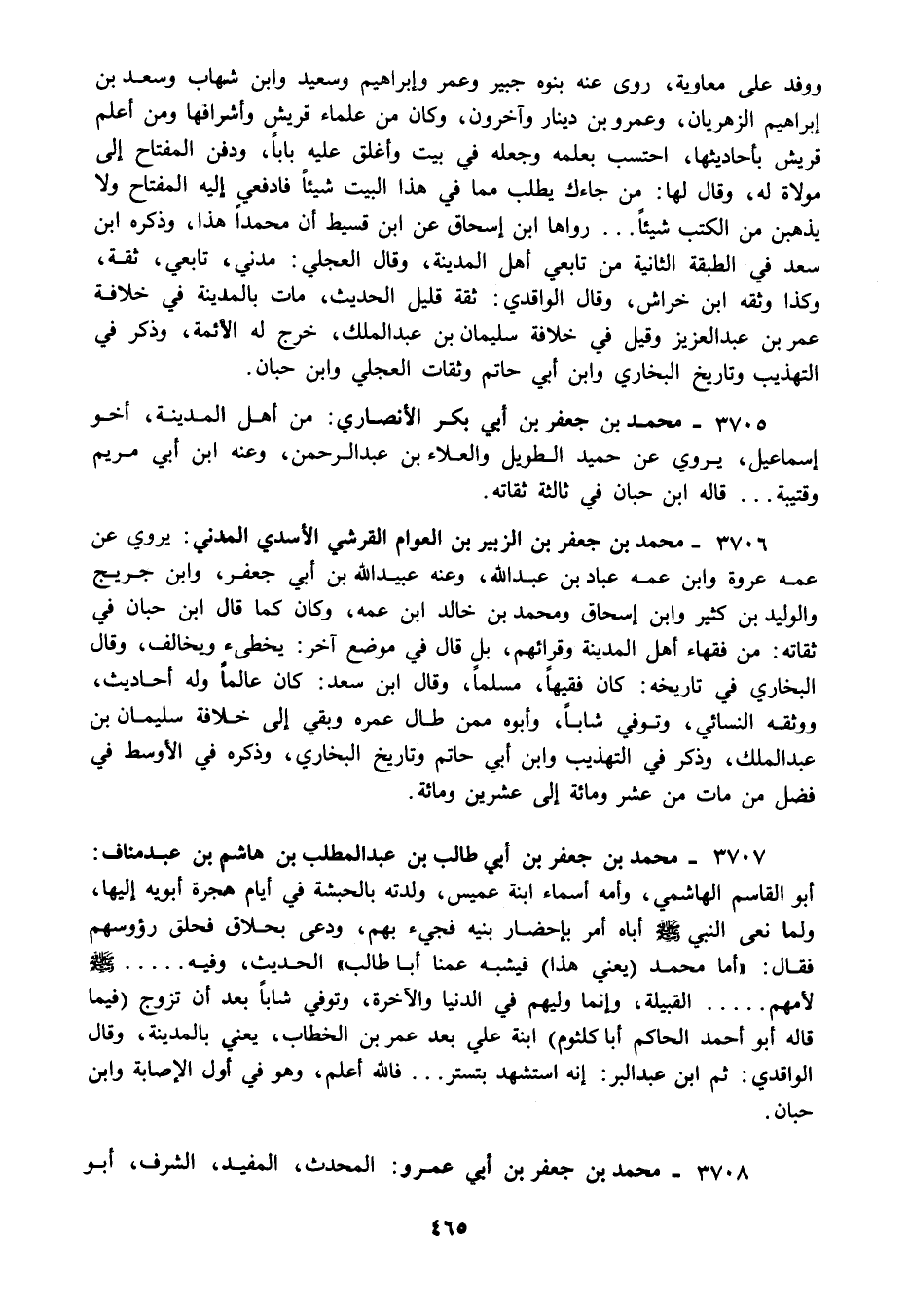 3705 - محمد بن جعفر بن ابي بكر الأنصاري: من أهل المدينة أخو إسماعيل يروي عن حميد الطويل والعلاء بن عبد الرحمن وعنه ابن ابي مريم وقتيبة قاله ابن حبان في ثالثة ثقاته.