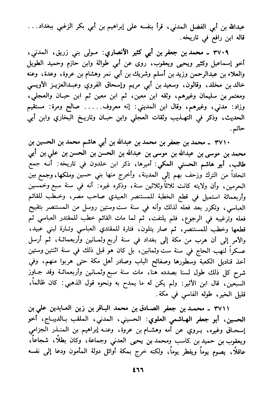 3709 - محمد بن ابي جعفر المدني: يروي عن سالم بن عبد الله بن عمر وعنه هشيم بن بشيرقاله ابن حبان في ثالثة ثقاته وهو عند البخاري في تاريخه وابن أبي حاتم.