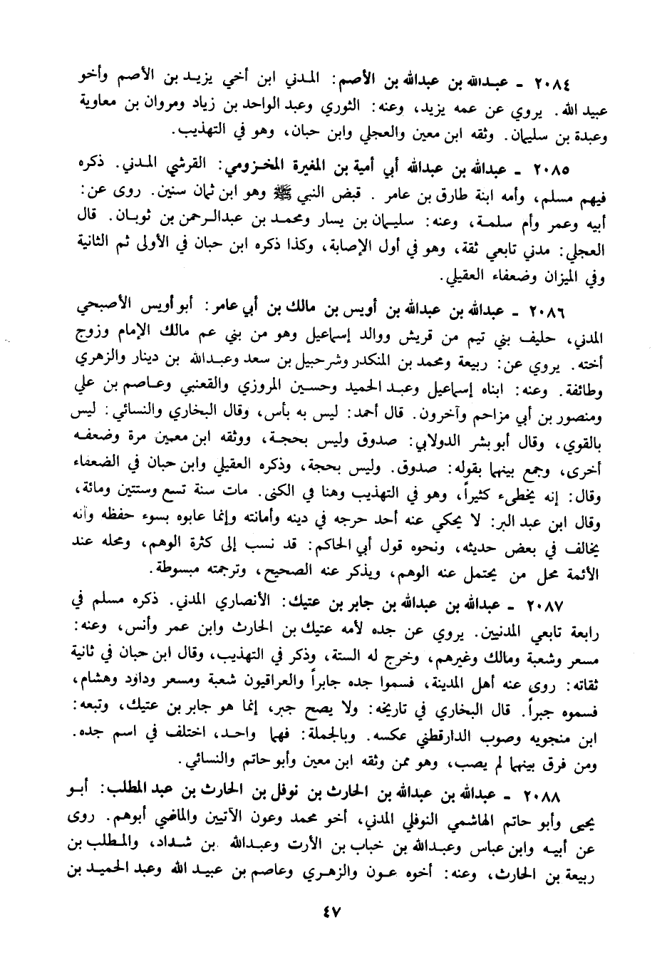 2084 - عبد الله بن عبد الله بن الأصم: المدني ابن أخي يزيد بن الأصم وأخو عبيد الله يروي عن عمه يزيد وعنه: الثوري وعبد الواحد بن زياد ومروان بن معاوية وعبدة بن سليمان وثقه ابن معين والعجلي وابن حبان وهو في التهذيب.