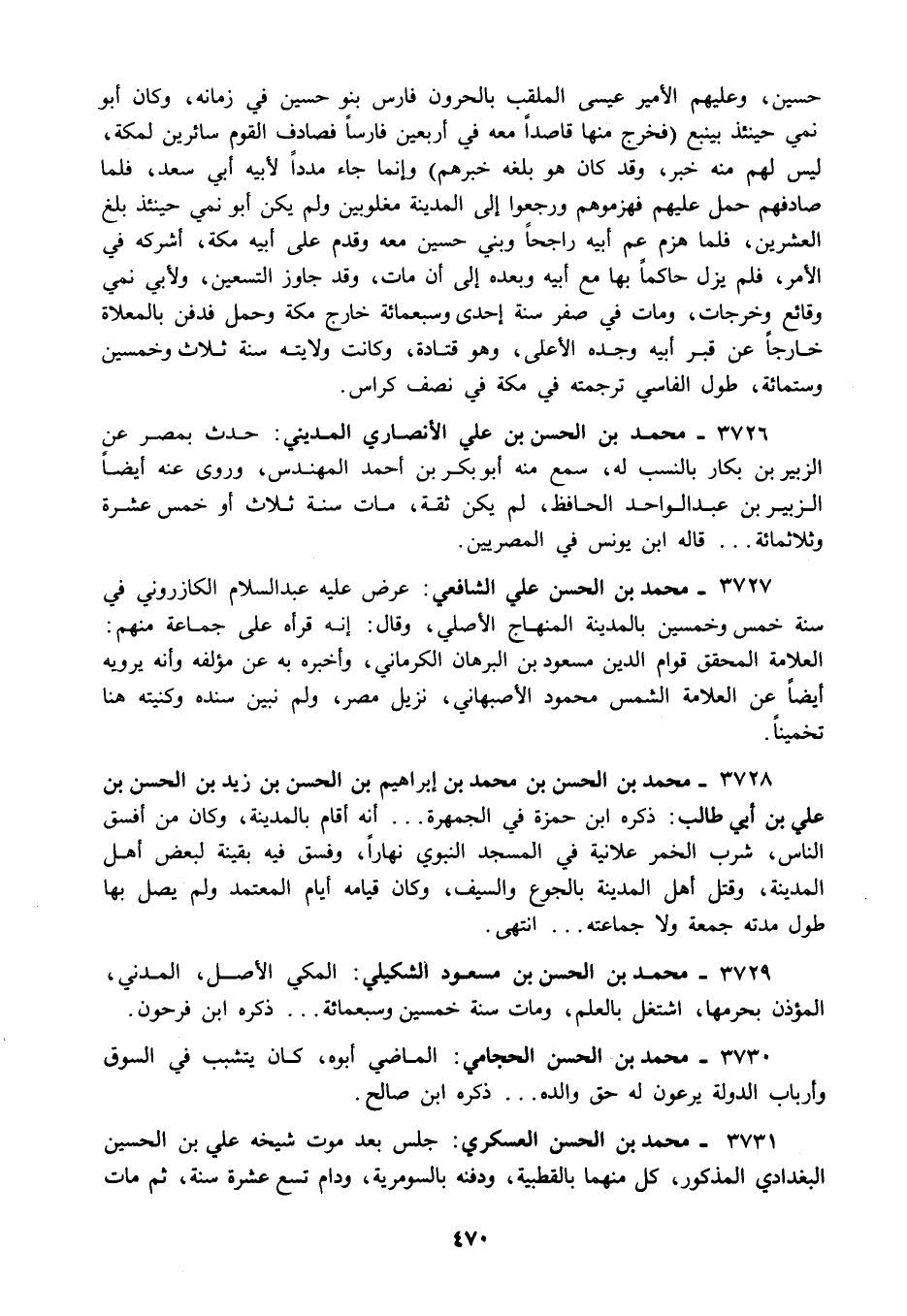 3728 - محمد بن الحسن بن محمد بن إبراهيم بن الحسن بن زيد بن الحسن بن علي بن أبي طالب: ذكره ابن حمزة في الجمهرة أنه أقام بالمدينة وكان من أفسق الناس شرب الخمر علانية في المسجد النبوي نهارا وفسق فيه بقينة لبعض أهل المدينة وقتل أهل المدينة بالجوع والسيف وكان قيامه أيام المعتمد ولم يصل بها طول مدته جمعة ولا جماعته انتهى.