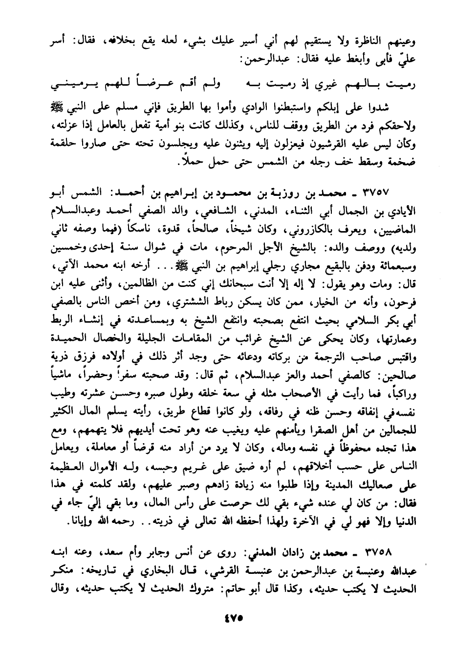 3757 - محمد بن روزبة بن محمود بن إبراهيم بن أحمد: الشمس أبو الأيادي بن الجمال أبي الثناء المدني الشافعي والد الصفي احمد وعبد السلام الماضيين ويعرف بالكازروني وكان شيخا صالحا قدوة ناسكا "فيما وصفه ثاني ولديه" ووصف والده: بالشيخ الأجل المرحوم مات في شوال سنة إحدى وخمسين وسبعمائة ودفن بالبقيع مجاري رجلي إبراهيم بن النبي صلى الله عليه وسلم أرخه ابنه محمد الآتي قال: ومات وهو يقول: لا إله إلا أنت سبحانك إني كنت من الظالمين وأثنى عليه ابن فرحون وأنه من الخيار ممن كان يسكن رباط الششتري ومن أخص الناس بالصفي أبي بكسر السلامي بحيث انتفع بصحبته وانتفع الشيخ به وبمساعدته في إنشاء الربط وعمارتها وكان يحكى عن الشيخ غرائب من المقامات الجليلة والخصال الحميدة واقتبس صاحب الترجمة من بركاته ودعائه حتى وجد أثر ذلك في أولاده فرزق ذرية صالحين: كالصفي أحمد والعز عبد السلام ثم قال: وقد صحبته سفرا وحضرا ماشيا وراكبا فما رأيت في الأصحاب مثله في سعة خلقه وطول صبره وحسن عشرته وطيب نفسه في إنفاقه وحسن ظنه في رفاقه ولو كانوا قطاع طريق رأيته يسلم المال الكثير للجمالين من أهل الصقرا ويأمنهم عليه ويغيب عنه وهو تحت أيديهم فلا يتهمهم ومع هذا تجده محفوظا في نفسه وماله وكان لا يرد من أراد منه قرضا أو معاملة ويعامل الناس على حسب أخلاقهم لم أره ضيق على غريم وحبسه وله الأموال العظيمة على صعاليك المدينة وإذا طلبوا منه زيادة زادهم وصبر عليهم ولقد كلمته في هذا فقال: من كان لي عنده شيء بقي لك حرصت على رأس المال وما بقي إلي جاء في الدنيا وإلا فهو لي في الآخرة ولهذا أحفظه الله تعالى في ذريته رحمه الله وإيانا.