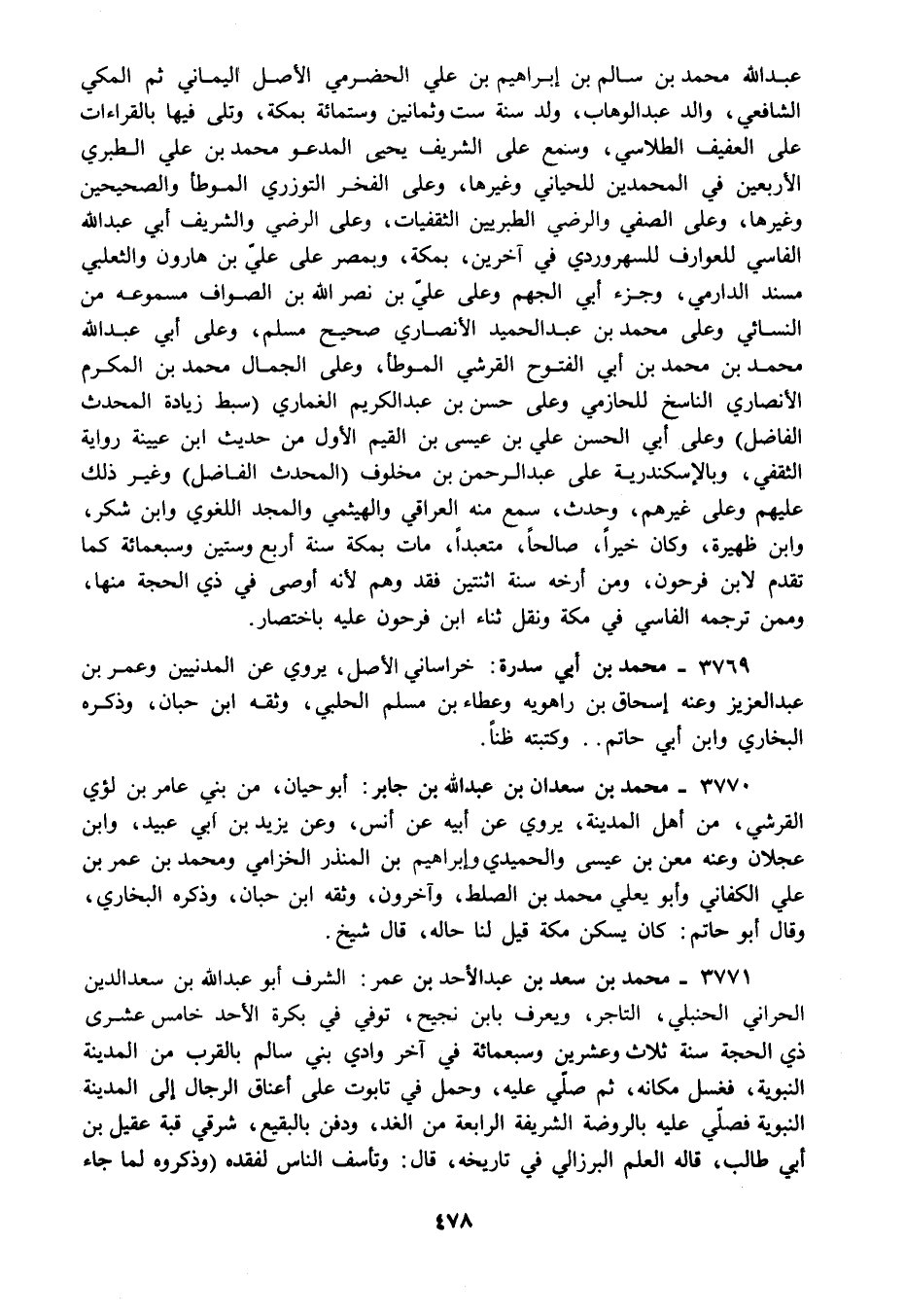 3771 - محمد بن سعد بن عبد الأحد بن عمر: الشرف أبو عبد الله بن سعد الدين الحراني الحنبلي التاجر ويعرف بابن نجيح توفي في بكرة الأحد خامس عشرى ذي الحجة سنة ثلاث وعشرين وسبعمائة في آخر وادي بني سالم بالقرب من المدينة النبوية فغسل مكانه ثم صلي عليه وحمل في تابوت على أعناق الرجال إلى المدينة النبوية فصلي عليه بالروضة الشريفة الرابعة من الغد ودفن بالبقيع شرقي قبة عقيل بن أبي طالب قاله العلم البرزالي في تاريخه قال: وتأسف الناس لفقده "وذكروه لما جاء