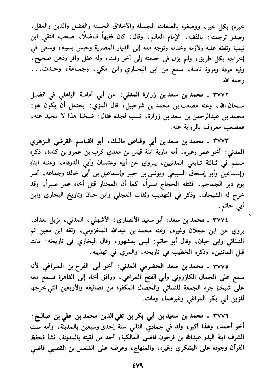 3772 - محمد بن سعد بن زرارة المدني: عن أبي أمامة الباهلي في فضل سبحان الله وعنه مصعب بن محمد بن شرحبيل قال المزي: يحتمل أن يكون هو: محمد بن عبد الرحمن بن سعد بن زرارة نسب لجده فقال: شيخنا هذا لا محيد عنه فمصعب معروف بالرواية عنه.