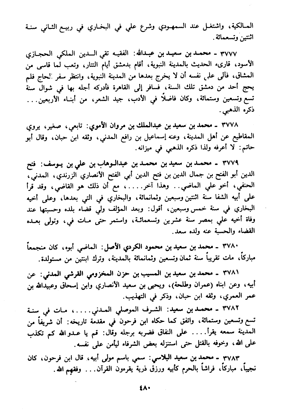 3783 - محمد بن سعيد البلاسي: سمي باسم مولى أبيه قال ابن فرحون كان نجيبا مباركا فراشا بالحرم كأبيه ورزق ذرية يقرءون القرآن وفقهم الله.