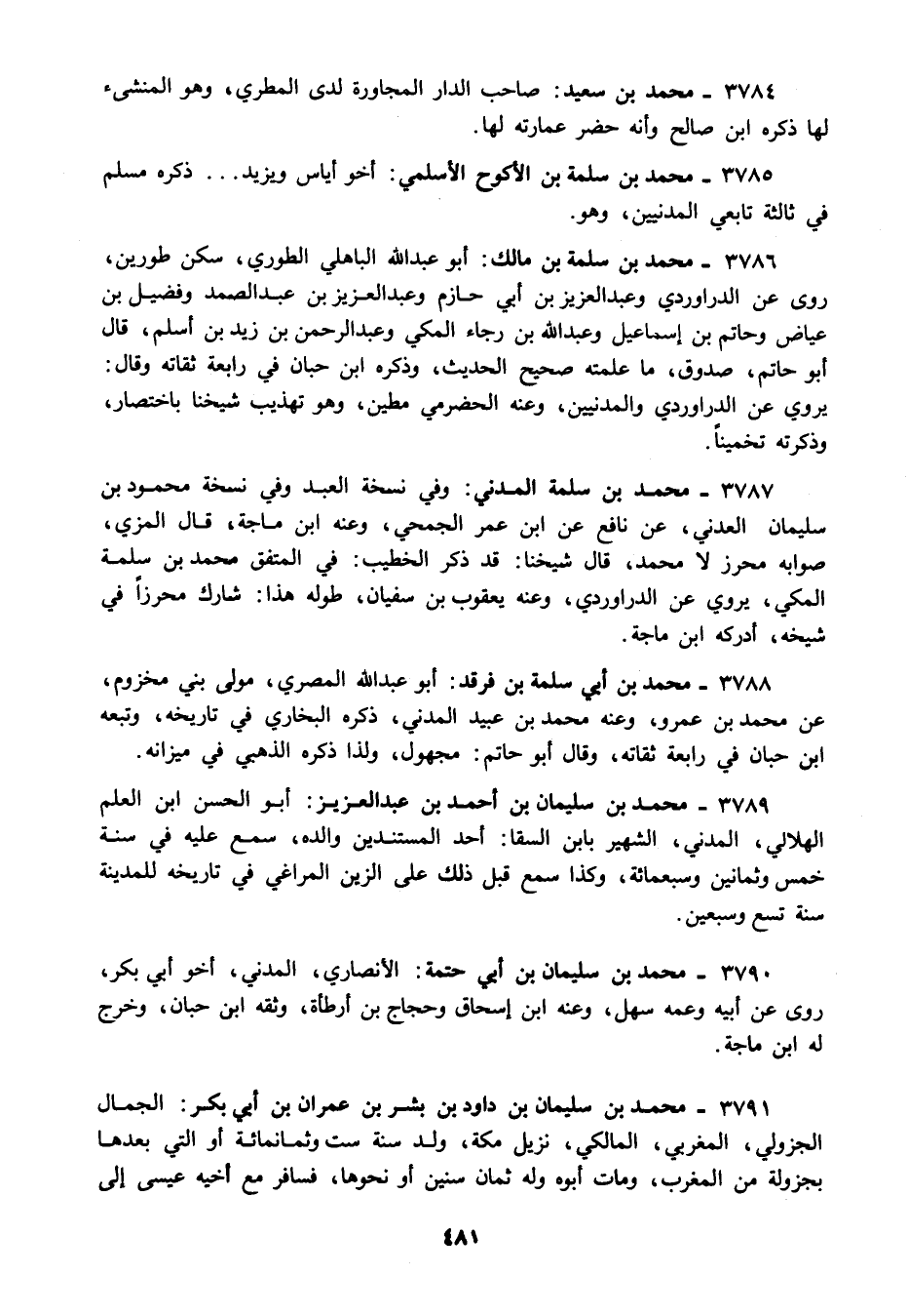 3787 - محمد بن سلمة المدني: وفي نسخة العبد وفي نسخة محمود بن سليمان العدني عن نافع عن ابن عمر الجمحي وعنه ابن ماجة قال المزي صوابه محرز لا محمد قال شيخنا: قد ذكر الخطيب: في المتفق محمد بن سلمة المكي يروي عن الدراوردي وعنه يعقوب بن سفيان طوله هذا: شارك محرزا في شيخه أدركه ابن ماجة.