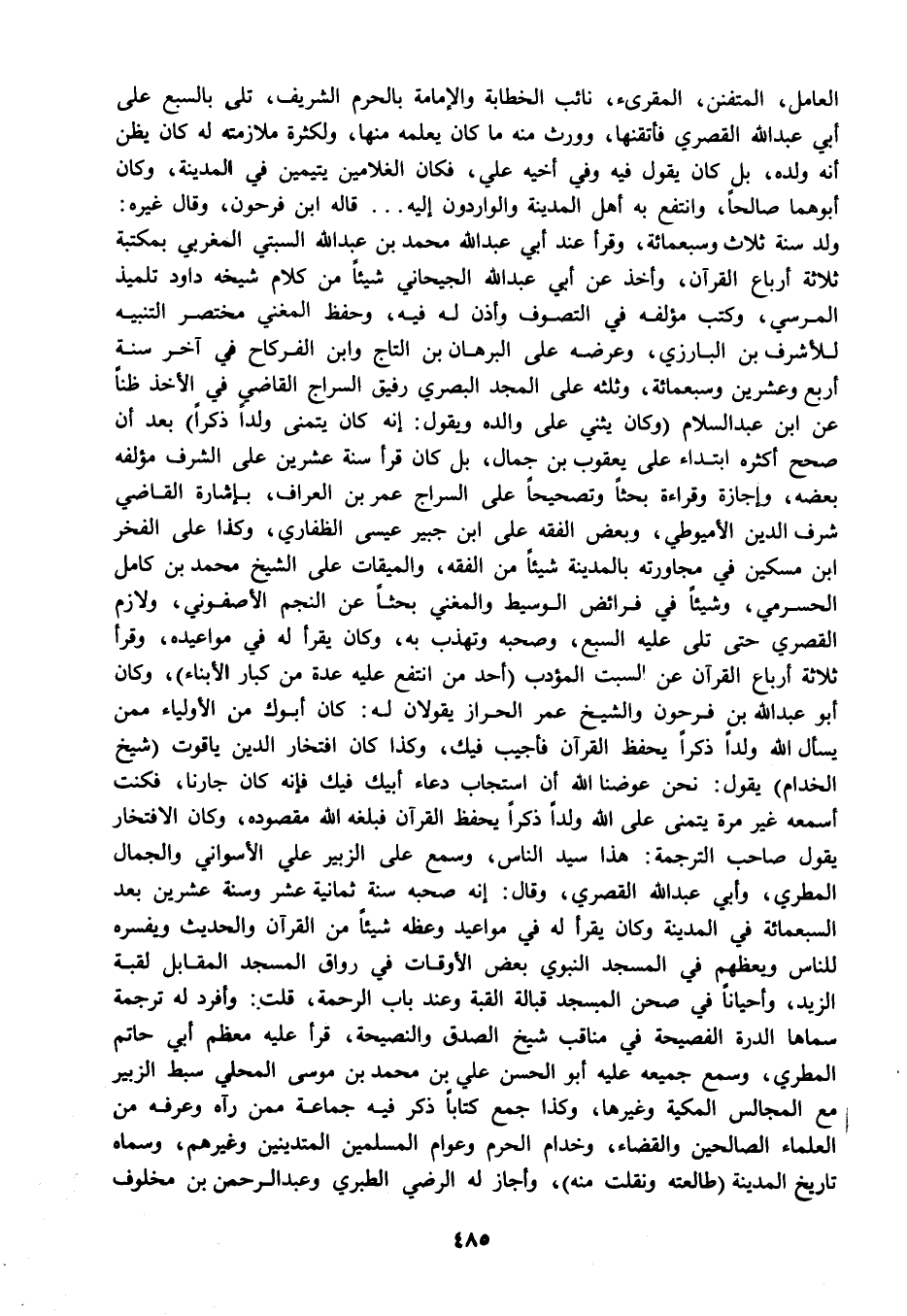 المتفنن المقرىء نائب الخطابة والإمامة بالحرم الشريف تلى بالسبع على أبي عبد الله القصري فأتقنها وورث منه ما كان يعلمه منها وكثرة ملازمته له كان يظن أنه ولده بل كان يقول فيه وفي أخيه علي فكان الغلامين يتيمين في المدينة وكان أبوهما صالحا وانتقع به أهل المدينة والواردون إليه قاله ابن فرحون وقال غيره: ولد سنة ثلاث وسبعمائة وقرأ عند أبي عبد الله محمد بن عبد الله السبتي المغربي بمكتبه ثلاثة أرباع القرآن وأخذ عن أبي عبد الله الجيحاني شيئا من كلام شيخه داود تلميذ المرسي وكتب مؤلفه في التصوف وأذن له فيه وحفظ المغني مختصر التنبيه للأشرف بن البارزي وعرضه على البرهان بن التاج وابن الفركاح في آخر سنة أربع وعشرين وسبعمائة وثلثه على المجد البصري رفيق السراج القاضي في الأخذ ظنا عن ابن عبد السلام "وكان يثني على والده ويقول: إنه كان يتمنى ولدا ذكرا" بعد أن صحح أكثره ابتداء على يعقوب بن جمال بل كان قرأ سنة عشرين على الشرف مؤلفه بعضه وإجازة وقراءة بحثا وتصحيحا على السراج عمر بن العراف بإشارة القاضي شرف الدين الأميوطي وبعض الفقه على ابن جبير عيسى الظفاري وكذا على الفخر ابن مسكين في مجاورته بالمدينة شيئا من الفقه والميقات على الشيخ محمد بن كامل الحسرمي وشيئا في فرائض الوسيط والمغني بحثا عن النجم الأصفوني ولازم القصري حتى تلى عليه السبع وصحبه وتهذب به وكان يقرأ له في مواعيده وقرأ ثلاثة أرباع القرآن عن السبت المؤدب "أحد من انتفع عليه عدة من كبار الأبناء" وكان أبو عبد الله بن فرحون والشيخ عمر الحراز يقولان له: كان أبوك من الأولياء ممن يسأل الله ولدا ذكرا يحفظ القرآن فإجيب فيك وكذا كان افتخار الدين ياقوت "شيخ الخدام" يقول: نحن عوضنا الله أن استجاب دعاء أبيك فيك فإنه كان جارنا فكنت أسمعه غير مرة يتمنى على الله ولدا ذكرا يحفظ القرآن فبلغه الله مقصوده وكان الافتخار يقول صاحب الترجمة: هذا سيد الناس وسمع علي الزبير على الأسواني والجمال المطري وأبي عبد الله القصري وقال: إنه صحبه سنة ثمانية عشر وسنة عشرين بعد السبعمائة في المدينة وكان يقرأ له في مواعيد وعظه شيئا من القرآن والحديث ويفسره للناس ويعظهم في المسجد النبوي بعض الأوقات في رواق المسجد المقابل لقبة الزيد وأحيانا في صحن المسجد قبالة القبة وعند باب الرحمة قلت: وأفرد له ترجمة سماها الدرة الفصيحة في مناقب شيخ الصدق والنصيحة قرأ عليه معظم أبي حاتم المطري وسمع جميعه عليه أبو الحسن على بن محمد بن موسى المحلي سبط الزبير مع المجالس المكية وغيرها وكذا جمع كتابا ذكر فيه جماعة ممن رآه وعرفه من العلماء الصالحين والقضاء وخدام الحرام وعوام المسلمين المتدينين وغيرهم وسماه تاريخ المدينة "طالعته ونقلت منه" وأجاز له الرضي الطبري وعبد الرحمن بن مخلوف