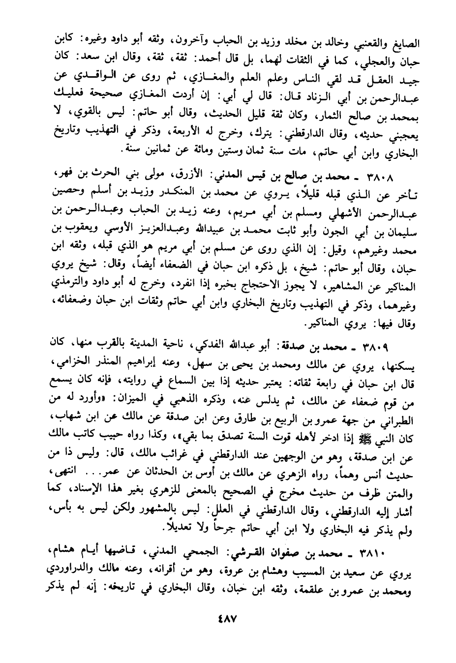 3809 - محمد بن صدقة: أبو عبد الله الفدكي ناحية المدينة بالقرب منها كان يسكنها يروي عن مالك ومحمد بن يحيى بن سهل وعنه إبراهيم المنذر الخزامي قال ابن حبان في رابعة ثقاته: يعتبر حديثة إذا بين السماع في روايته فإنه كان يسمع من قوم ضعفاء عن مالك ثم يدلس عنه وذكره الذهبي في الميزان: "وأورد له من الطبراني من جهة عمرو بن الربيع بن طارق وعن ابن صدقة عن مالك عن ابن شهاب كان النبي صلى الله عليه وسلم إذا ادخر لأهله قوت السنة تصدق بما بقي" وكذا رواه حبيب كاتب مالك عن ابن صدقة وهو من الوجهين عند الدارقطني في غرائب مالك قال: وليس ذا من حديث أنس وهما رواه الزهري عن مالك بن أوس بن الحدثان عن عمر انتهى والمتن ظرف من حديث مخرج في الصحيح بالمعنى الزهري بغير هذا الإسناد كما أشار إليه الدارقطني وقال الدارقطني في العلل: ليس بالمشهور ولكن ليس به بأس ولم يذكر فيه البخاري ولا ابن أبي حاتم جرحا ولا تعديلا.