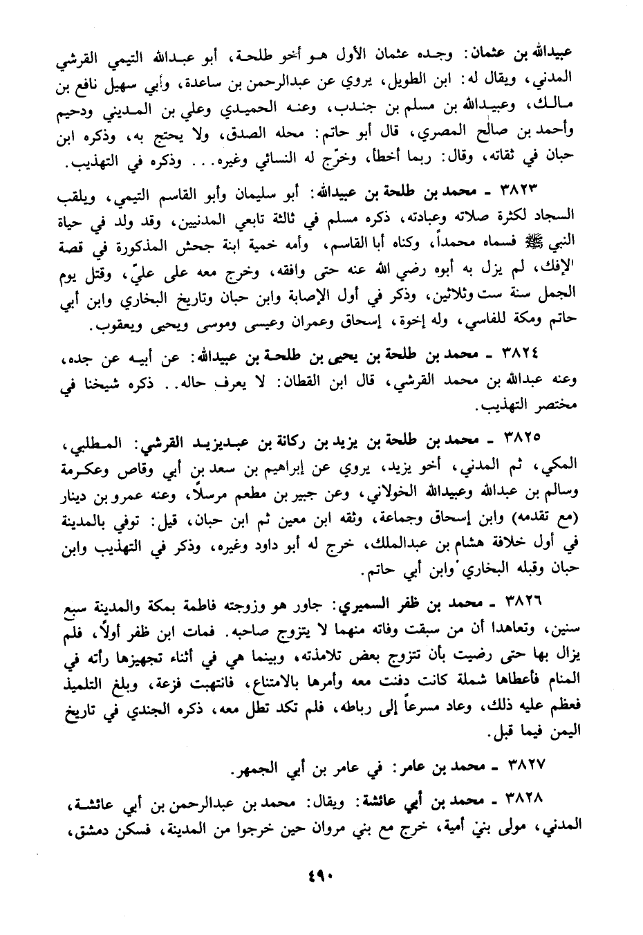 3824 - محمد بن طلحة بن حيى بن طلحة بن عبيد الله: عن أبيه عن جده وعنه عبد الله بن محمد القرشي قال ابن القطان: لا يعرف حاله ذكره شيخنا في مختصر التهذيب.