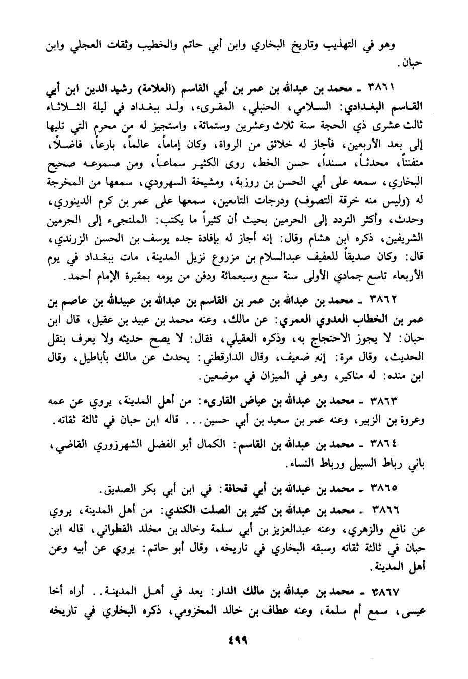 3861 - محمد بن عبد الله بن عمر بن أبي القاسم "العلامة" رشيد الدين ابن أبي القاسم البغدادي: السلامي الحنبلي المقرىء ولد ببغداد في ليلة الثلاثاء ثالث عشرى ذي الحجة سنة ثلاث وعشرين وستمائة واستجيز له من محرم التي تليها إلى بعد الأربعين فأجاز له خلائق من الرواة وكان إماما عالما بارعا فاضلا متفننا محدثا مسندا حسن الخط روى الكثير سماعا ومن مسموعه صحيح البخاري سمعه على أبي الحسن بن روزبة ومشيخة السهرودي سمعها من المخرجة له "وليس منه خرقة التصوف" ودرجات التابعين سمعها على عمر بن كرم الدينوري وحدث وأكثر التردد إلى الحرمين بحيث أن كثيرا ما يكتب: الملتجىء إلى الحرمين الشريفين ذكره ابن هشام وقال: إنه أجاز له بإفادة جده يوسف بن الحسن الزرندي قال: وكان صديقا للعفيف عبد السلام بن مزروع نزيل المدينة مات ببغداد في يوم الأربعاء تاسع جمادي الأولى سنة سبع وسبعمائة ودفن من يومه بمقبرة الإمام أحمد.