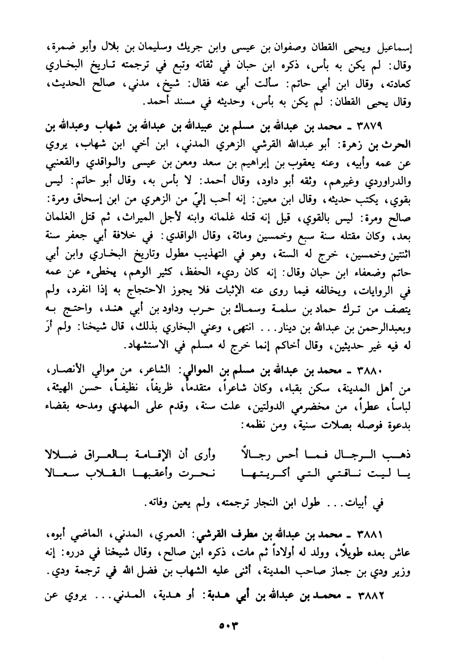 3881 - محمد بن عبد الله بن مطرف القرشي: العمري المدني الماضي أبوه عاش بعده طويلا وولد له أولادا ثم مات ذكره ابن صالح وقال شيخنا في درره: إنه وزير ودي بن جماز صاحب المدينة أثنى عليه الشهاب بن فضل الله في ترجمة ودي.