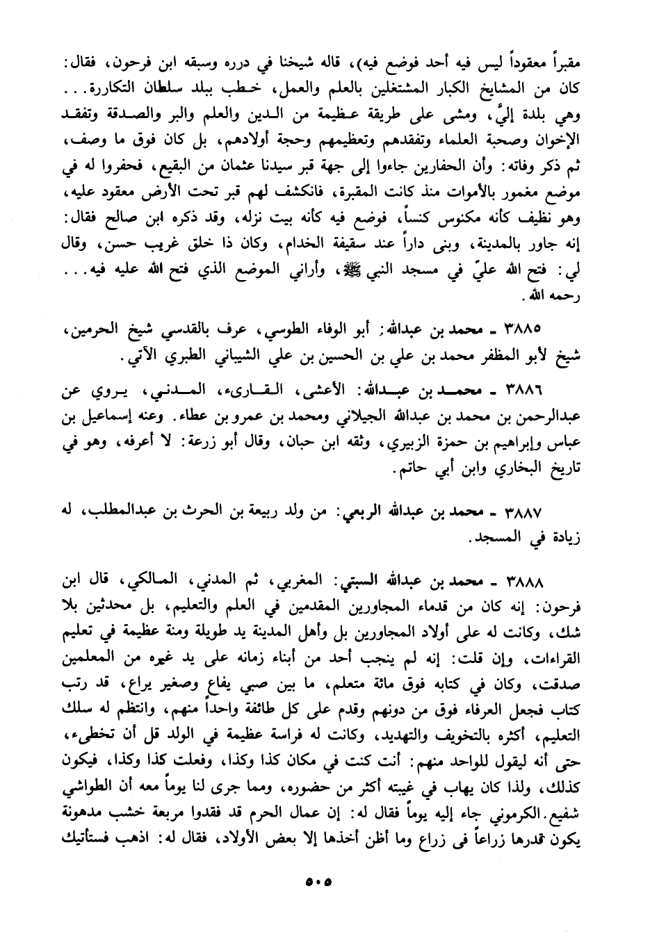 3888 - محمد بن عبد الله السبتي: المغربي ثم المدني المالكي قال ابن فرحون: إنه كان من قدماء المجاورين المقدمين في العلم والتعليم بل محدثين بلا شك وكانت له على أولاد المجاورين بل وأهل المدينة يد طويلة ومنة عظيمة في تعليم القراءات وإن قلت: إنه لم ينجب أحد من أبناء زمانه على يد غيره من المعلمين صدقت وكان في كتابه فوق مائة متعلم ما بين صبي يفاع وصغير يراع قد رتب كتاب فجعل العرفاء فوق من دونهم وقدم على كل طائفة واحدا منهم وانتظم له سلك التعليم أكثره بالتخويف والتهديد وكانت له فراسة عظيمة في الولد قل أن تخطىء حتى أنه ليقول للواحد منهم: أنت كنت في مكان كذا وكذا وفعلت كذا وكذا فيكون كذلك ولذا كان يهاب في غيبته أكثر من حضوره ومما جرى لنا يوما معه أن الطواشي شفيع الكرموني جاء إليه يوما فقال له: إن عمال الحرم قد فقدوا مربعة خشب مدهونة يكون قدرها زراعا في زراع وما أظن أخذها إلا بعض الأولاد فقال له: اذهب فستأتيك