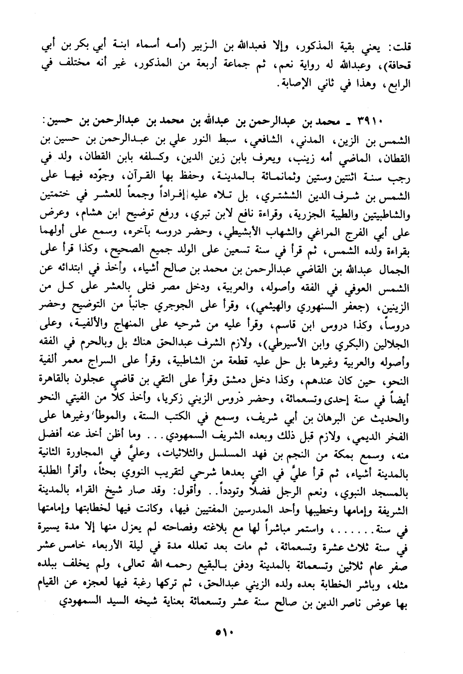 3910 - محمد بن عبد الرحمن بن عبد الله بن محمد بن عبد الرحمن بن حسين: الشمس بن الزين المدني الشافعي سبط النور علي بن عبد الرحمن بن حسين بن القطان الماضي أمه زينب ويعرف بابن زين الدين وكسلفه بابن القطان ولد في رجب سنة اثنتين وستين وثمانمائة بالمدينة وحفظ بها القرآن وجوده فيها على الشمس بن شرف الدين الششتري بل تلاه عليه إفرادا وجمعا للعشر في ختمتين والشاطبيتين والطيبة الجزرية وقراءة نافع لأبن تبري ورفع توضيح ابن هشام وعرض على أبي الفرج المراغي والشهاب الأبشيطي وحضر دروسه بآخره وسمع على أولهما بقراءة ولده الشمس ثم قرأ في سنة تسعين على الولد جميع الصحيح وكذا قرأ على الجمال عبد الله بن القاضي عبد الرحمن بن محمد بن صالح أشياء وأخذ في ابتدائه عن الشمس العوفي في الفقه وأصوله والعربية ودخل مصر فتلى بالعشر على كل من الزينين "جعفر السنهوري والهيثمي" وقرأ على الجوجري جانبا من التوضيح وحضر دروسا وكذا دروس ابن قاسم وقرأ عليه من شرحيه على المنهاج والألفية وعلى الجلالين "البكري وابن الأسيوطي" ولازم الشرف عبد الحق هناك بل وبالحرم في الفقه وأصوله والعربية وغيرها بل حل عليه قطعة من الشاطبية وقرأ على السراج معمر ألفية النحو حين كان عندهم وكذا دخل دمشق وقرأ على التقي بن قاضي عجلون بالقاهرة أيضا في سنة إحدى وتسعمائة وحضر دروس الزيني زكريا وأخذ كلا من الفيتي النحو والحديث عن البرهان بن أبي شريف وسمع في الكتب الستة والموطأ وغيرها على الفخر الديمي ولازم قبل ذلك وبعده الشريف السمهودي وما أظن أخذ عنه أفضل منه وسمع بمكة من النجم بن فهد المسلسل والثلاثيات وعلي في المجاورة الثانية بالمدينة أشياء ثم قرأ علي في التي بعدها شرحي لتقريب النووي بحثا وأقرأ الطلبة بالمسجد النبوي ونعم الرجل فضلا وتوددا وأقول: وقد صار شيخ القراء بالمدينة الشريفة وإمامها وخطيبها وأحد المدرسين المفتيين فيها وكانت فيها لخطابتها وإمامتها في سنة واستمر مباشرا لها مع بلاغته وفصاحته لم يعزل منها إلا مدة يسيرة في سنة ثلاث عشرة وتسعمائة ثم مات بعد تعلله مدة في ليلة الأربعاء خامس عشر صفر عام ثلاثين وتسعمائة بالمدينة ودفن بالبقيع رحمه الله تعالى ولم يخلف ببلده مثله وباشر الخطابة بعده ولده الزيني عبد الحق ثم تركها رغبة فيها لعجزه عن القيام بها عوض ناصر الدين بن صالح سنة عشر وتسعمائة بعناية شيخه السيد السمهودي وتودداوأقول وقد صار شيخ القراء بالمدينة الشريفة وإمامها وخطيبها وأحد المدرسين المفتيين فيها وكانت فيها لخطابتها وإمامتها في سنة واستمر مباشرا لها مع بلاغته وفصاحته لم يعزل منها إلا مدة يسيرة في سنة ثلاث عشرة وتسعمائة ثم مات بعد تعلله مدة في ليلة الأربعاء خامس عشر صفر عام ثلاثين وتسعمائة بالمدينة ودفن بالبقيع رحمه الله تعالى ولم يخلف ببلده مثله وباشر الخطابة بعده ولده الزيني عبد الحق ثم تركها رغبة فيها لعجزه عن القيام بها عوض ناصر الدين بن صالح سنة عشر وتسعمائة بعناية شيخة السيد السمهودي.