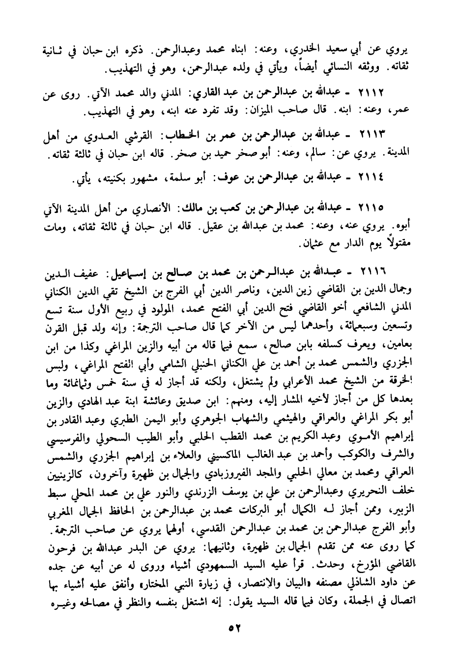 2116 - عبد الله بن عبد الرحمن بن محمد بن صالح بن إسماعيل: عفيف الدين وجمال الدين بن القاضي زين الدين وناصر الدين أبي الفرج بن الشيخ تقي الدين الكناني المدني الشافعي أخو القاضي فتح الدين أبي الفتح محمد المولود في ربيع الأول سنة تسع وتسعين وسبعمائة وأحدهما ليس من الآخر كما قال صاحب الترجمة: وإنه ولد قبل القرن بعامين ويعرف كسلفه بابن صالح سمع فيما قاله من أبيه والزين المراغي وكذا من ابن الجزري والشمس محمد بن أحمد بن علي الكناني الحنبلي الشامي وأبي الفتح المراغي ولبس الخرقة من الشيخ محمد الأعرابي ولم يشتغل, ولكنه قد أجاز له في سنة خمس وثمانمائة وما بعدها كل من أجاز لأخيه المشار إليه ومنهم ابن صديق وعائشة ابنة عبد الهادي والزين أبو بكر المراغي والعراقي والهيثمي والشهاب الجوهري وأبو اليمن الطبري وعبد القادر بن إبراهيم الأموي وعبد الكريم بن محمد القطب الحلبي وأبو الطيب السحولي والفرسيسي والشرف والكوكب وأحمد بن عبد الغالب الماكسيني والعلاء بن إبراهيم الجزري والشمس العراقي ومحمد بن معالي الحلبي والمجد الفيروزبادي والجمال بن ظهيرة وآخرون كالزينيين خلف النحريري وعبد الرحمن بن علي بن يوسف الزرندي والنور علي بن محمد المحلي سبط الزبير وممن أجاز له الكمال أبو البركات محمد بن عبد الرحمن بن الحافظ الجمال المغربي وأبو الفرج عبد الرحمن بن محمد بن عبد الرحمن القدسي أولهما يروي عن صاحب الترجمة. كما روى عنه ممن تقدم الجمال بن ظهيرة وثانيهما يروي عن البدر عبد الله بن فرحون القاضي المؤرخ وحدث قرأ عليه السيد السمهودي أشياء وروى له عن أبيه عن جده عن داود الشاذلي مصنفه "البيان والانتصار في زيارة النبي صلى الله عليه وسلم المختار" وأنفق عليه أشياء بها اتصال في الجملة وكان فيما قاله السيد يقول إنه اشتغل بنفسه والنظر في مصالحه وغيره