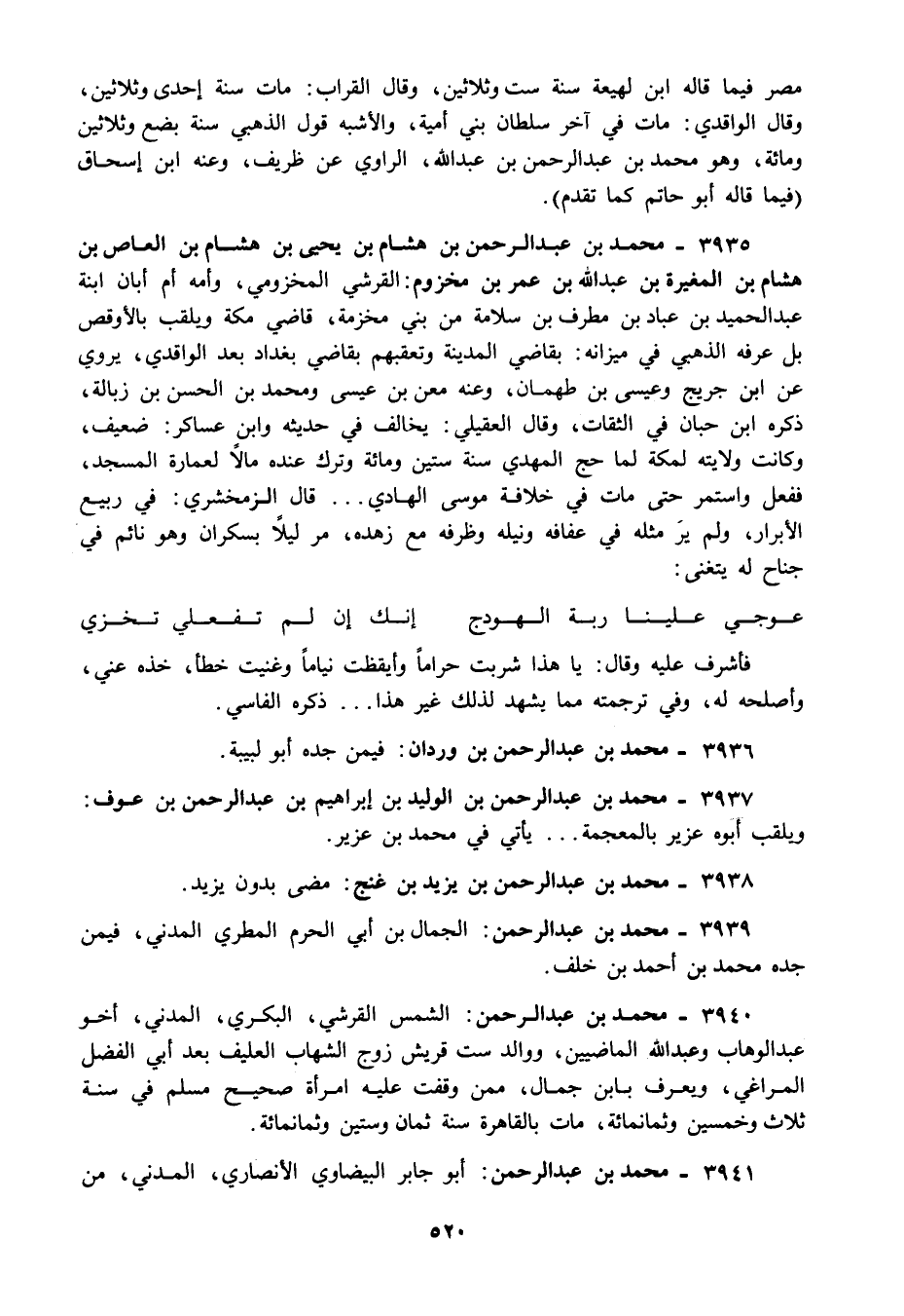 3935 - محمد بن عبد الرحمن بن هشام بن يحيى بن هشام بن العاص بن هشام بن المغيرة بن عبد الله بن عمر بن مخزوم: القرشي المخزومي وامه أم أبان ابنة عبد الحميد بن عباد بن مطرف بن سلامة من بني مخزمة قاضي مكة ويلقب بالأوقص بل عرفه الذهبي في ميزانه: بقاضي المدينة وتعقبهم بقاضي بغداد بعد الواقدي يروي عن ابن جريج وعيسى بن طهمان وعنه معن بن عيسى ومحمد بن الحسن بن زبالة ذكره ابن حبان في الثقات وقال العقيلي: يخالف في حديثه وابن عساكر: ضعيف وكانت ولايته لمكة لما حج المهدي سنة ستين ومائة وترك عنده مالا لعمارة المسجد ففعل واستمر حتى مات في خلافة موسى الهادي قال الزمخشري: في ربيع الأبرار ولم ير مثله في عفافه ونيله وظرفه مع زهده مر ليلا بسكران وهو نائم في جناح له يتغنى: