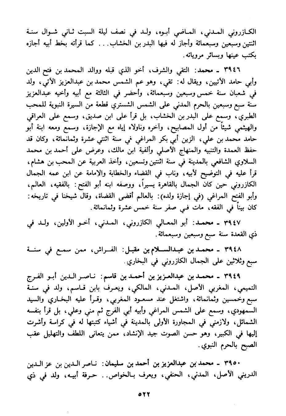 3947 – محمد: أبو المعالي الكازروني المدني أخو الأولين ولد في ذي القعدة سنة سبع وسبعين وسبعمائة.