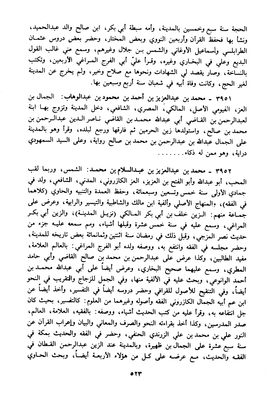 3952 - محمد بن عبد العزيز بن عبد السلام بن محمد: الشمس وربما لقب المحب أبو عبد الله وابو الفتح بن العزيز العز الكازروني المدني الشافعي ولد في جمادي الأولى سنة خمس وتسعين وسبعمائة وحفظ العمدة والتنبيه والحاوي "كلاهما في الفقه" والمنهاج الأصلي وألفية ابن مالك والشاطبية والتيسير والرابية وعرض على جماعة منهم الزين خلف بن أبي بكر المالكي "نزيل المدينة" والزين أبي بكر المراغي وسمع عليه في سنة خمس عشرة وقبلها أشياء ومم سمعه عليه جزء من حديث نصر المزجي وقبل ذلك في رمضان سنة اثنتين وثمانمائة بعض تاريخه للمدينة وحضر مجلسه في الفقه وانتفع به ووصفه ولده أبو الفرج المراغي: بالعالم العلامة مفيد الطالبين وكذا عرض على عبد الرحمن بن محمد بن صالح القاضي وأبي حامد المطري وسمع عليهما صحيح البخاري وعرض أيضا على أبي عبد الله محمد بن أحمد الوانوعي وبحث عليه في الألفية منها وفي الجمل للزجاج والتقريب في النحو أيضا وفي التنقيح للأصول للقرافي وحضر دروسه أيضا في التفسير وأخذ أيضا عن ابن عم أبيه الجمال الكازروني الفقه وأصوله وغيرهما من العلوم: كالتفسير بحيث كان جل انتفاعه به وقرأ عليه من كتب الحديث أشياء ووصفه: بالفقيه العلامة العالم صدر المدرسين وكذا أخذ بقراءته النحو والصرف والمعاني والبيان وإعراب القرآن عن النور علي بن محمد بن علي الزرندي الحنفي وحضر في الفقه والحديث بمكة في سنة سبع عشرة على الجمال بن ظهيرة وبالمدينة عند الزين عبد الرحمن القطان في الفقه والحديث مع عرضه على كل من هؤلاء الأربعة أيضا وبحث الحاوي