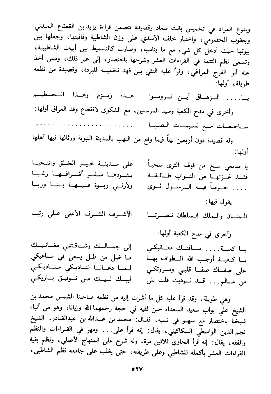 وبلوغ المراد في تخميس بانت سعاد وقصيدة تتضمن قراءة يزيد بن القعقاع المدني ويعقوب الحضرمي واختيار خلف الأسدي على وزن الشاطبية وقافيتها وجعلها بين بيوتها حيث ادخل كل شيء مع ما يناسبه وصارت كالتسميط بين أبيات الشاطبية وتسمى نظم التتمة في القراءات العشر وشرحها باختصار إلى غير ذلك وممن أخذ عنه أبو الفرج المراغي وقرأ عليه التقي بن فهد تخميسه للبردة وقصيدة من نظمه طويلة أولها: