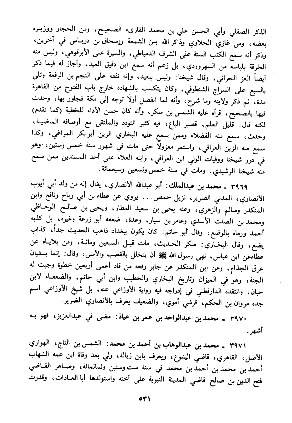 3969 - محمد بن عبد الملك: أبو عبد الله الأنصاري يقال إنه من ولد أبي أيوب الأنصاري المدني الضرير نزيل حمص يروي عن عطاء بن ابي رباح ونافع وابن المنكدر وسالم والزهري وعنه يحيى بن سعيد العطار ويحيى بن صالح الوحاظي ومحمد بن الصلت الأسدي وعامر بن سيار وعدة ضعفه أبو زرعة وغيره بل كذبه أحمد ورماه بالوضع وقال أبو حاتم: كان يكون ببغداد ذاهب الحديث جدا كذاب يضع وقال البخاري: منكر الحديث مات قبل السبعين ومائة ومن بلاياه عن عطاء عن ابن عباس نهى رسول الله صلى الله عليه وسلم أن يتخلل بالقصب والأسن وقال: إنما يسقيان عرق الجذام وعن ابن المنكدر عن جابر رفعه من قاد أعمى أربعين خطوة وجبت له الجنة وهو في الميزان وتاريخ البخاري والخطيب وابن أبي حاتم والضعفاء لابن حبان وانتقده الدارقطني في إدراجه فيه رواية الأوزاعي عنه بل شيخ الأوزاعي اسم جده مروان بن الحكم قرشي أموي والضعيف يعرف بالأنصاري الضرير.