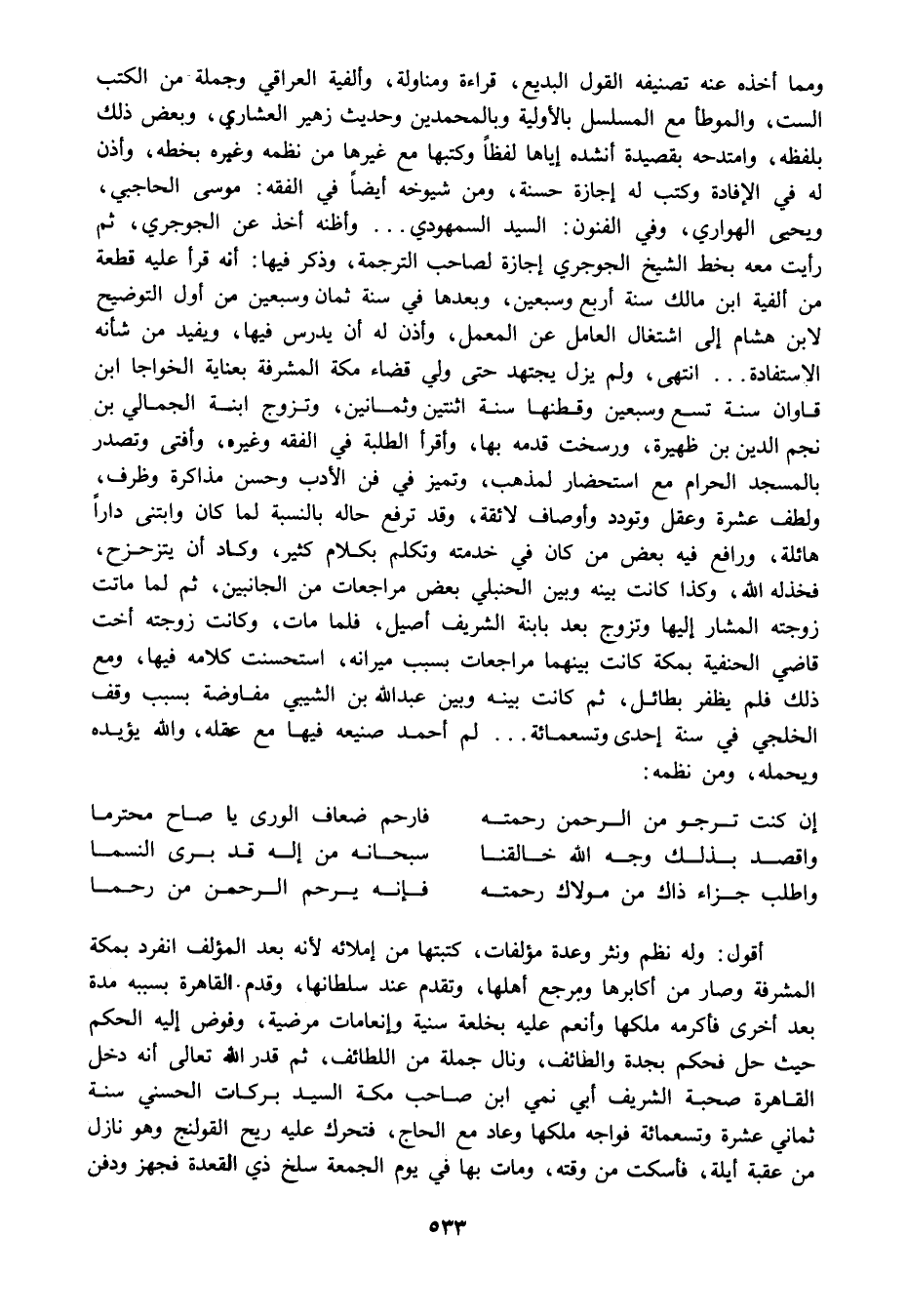أقول: وله نظم ونثر وعدة مؤلفات كتبتها من إملائه لأنه بعد المؤلف انفرد بمكة المشرفة وصار من أكابرها ومرجع أهلها وتقدم عند سلطانها وقدم القاهرة بسببه مدة بعد أخرى فأكرمه ملكها وأنعم عليه بخلعة سنية وإنعامات مرضية وفوض إليه الحكم حيث حل فحكم بجدة والطائف ونال جملة من اللطائف ثم قدر الله تعالى أنه دخل القاهرة صحبة الشريف أبي نمي ابن صاحب مكة السيد بركات الحسني سنة ثماني عشرة وتسعمائة فواجه ملكها وعاد مع الحاج فتحرك عليه ريح القولنج وهو نازل من عقبة أيلة فأسكت من وقته ومات بها في يوم الجمعة سلخ ذي القعدة فجهز ودفن