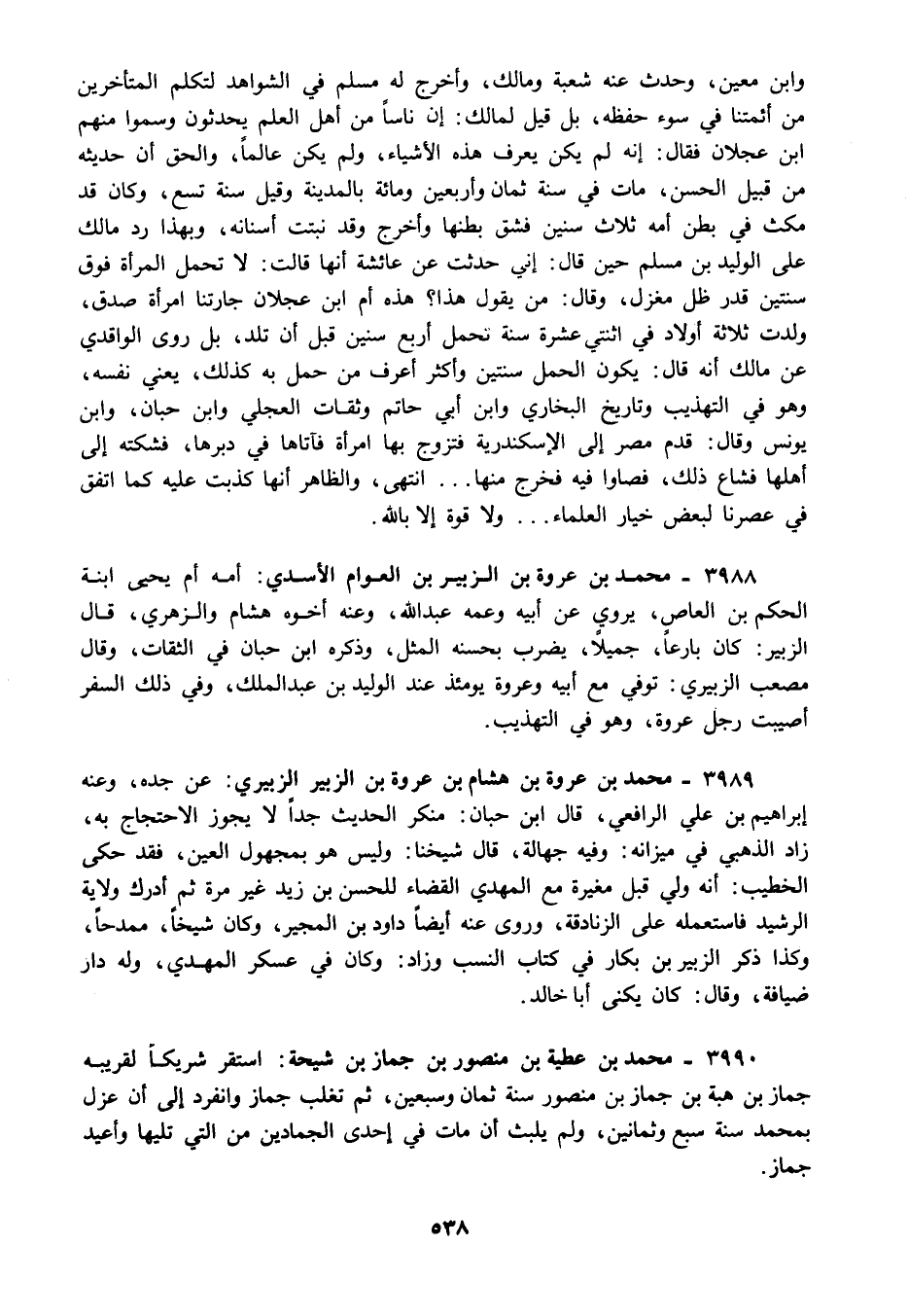 3989 - محمد بن عروة بن هشام بن عروة بن الزبير الزبيري: عن جده وعنه إبراهيم بن علي الرافعي قال ابن حبان: منكر الحديث جدا لا يجوز الاحتجاج به زاد الذهبي في ميزانه وفيه جهالة قال شيخنا: وليس هو بمجهول العين فقد حكى الخطيب: أنه ولي قبل مغيرة مع المهدي القضاء للحسن بن زيد غير مرة ثم أدرك ولاية الرشيد فاستعمله على الزنادقة وروى عنه أيضا داود بن المجير وكان شيخا ممدحا وكذا ذكر الزبير بن بكار في كتاب النسب وزاد وكان في عسكر المهدي وله دار ضيافة وقال كان يكنى أبا خالد.