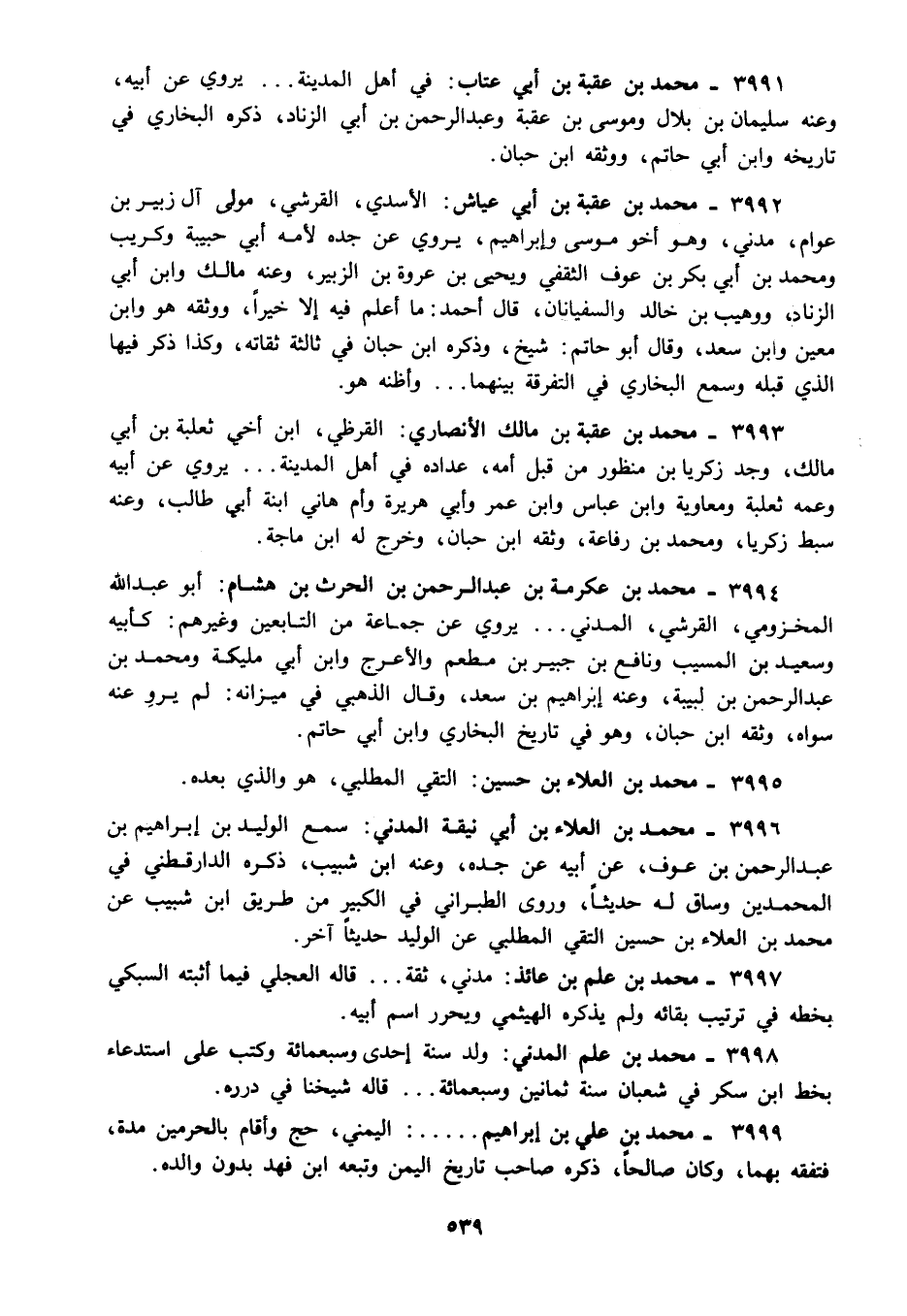 3991 - محمد بن عقبة بن أبي عتاب: في أهل المدينة يروي عن أبيه وعنه سليمان بن بلال وموسى بن عقبة وعبد الرحمن بن أبي الزناد ذكره البخاري في صاحب تاريخه وابن أبي حاتم ووثقه ابن حبان.