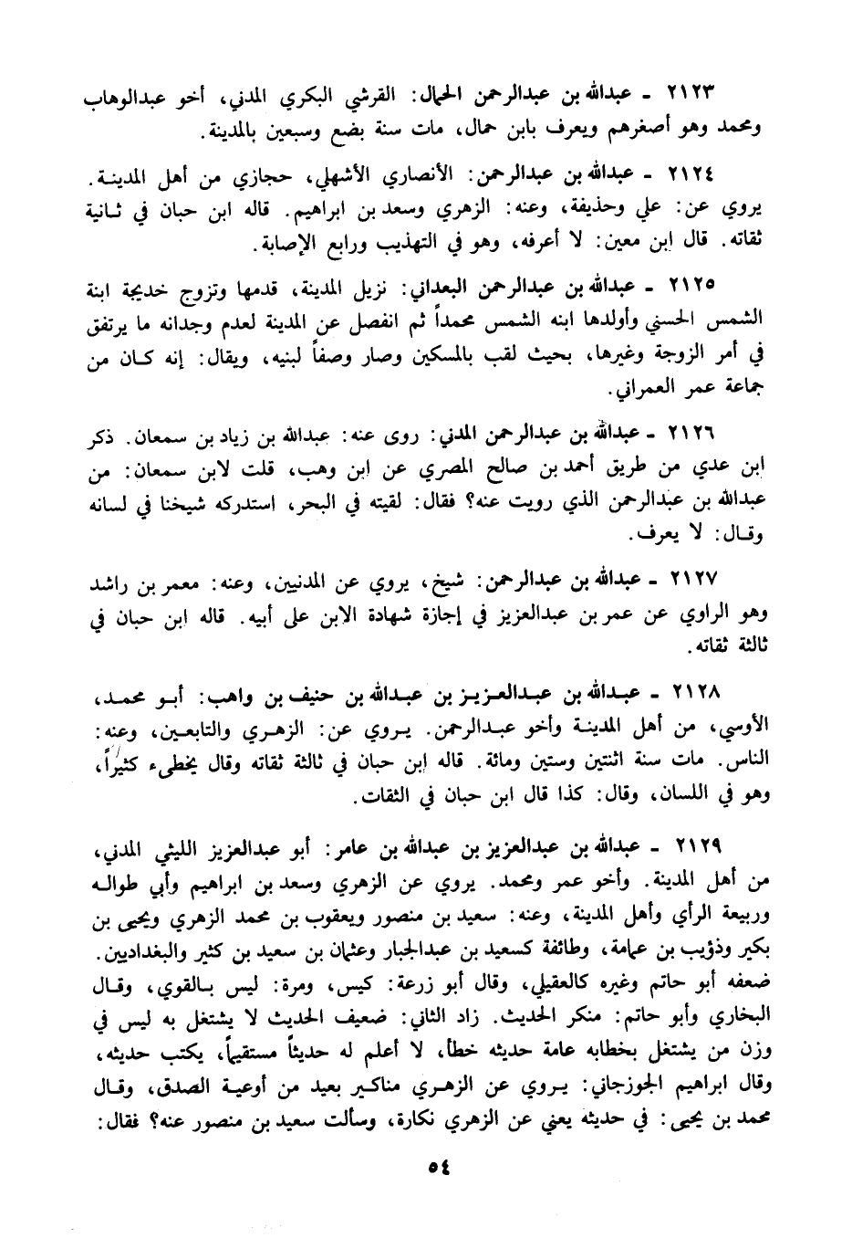 2123 - عبد الله بن عبد الرحمن الحمال: القرشي البكري المدني أخو عبد الوهاب ومحمد وهو أصغرهم ويعرف بابن حمال مات سنة بضع وسبعين بالمدينة.