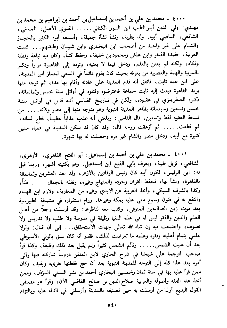 4000 - محمد بن علي بن أحمد بن إسماعيل بن أحمد بن إبراهيم بن محمد بن مهدي: ولي الدين أبو الطيب ابن النور الكناني الفوي الأصل المدني الشافعي الماضي أبوه ولد بطيبة ونشأ نشأة جميلة وأسمعه أبوه الكثير بالحجاز والشام على غير واحد من أصحاب ابن البخاري وابن شيبان وطبقتهم كست العربية حفيدة الفخر وابن غلش ومحمود بن خليفة وحفظ كتبا وكان فيه نباهة وفطنة وذكاء ولكنه لم يعتن بالعلم ودخل فيما لا يعنيه وتردد إلى القاهرة مرارا وذكر بالمروة والهمة والعصبية من يعرفه بحيث كان يقوم دائما في السعي لجماز أمير المدينة على ابن عمه ثابت فاتفق أنه قدم المدينة على عادته وأقام بها مدة ثم توجه منها يريد القاهرة فبعث إليه ثابت جماعة فاعترضوه وقتلوه في أوائل سنة خمس وثمانمائة ذكره المقريزي في عقوده ولكن في تاريخ الفاسي أنه قتل في أوائل سنة خمس وتسعين وسبعمائة بظاهر المدينة النبوية وهو متوجه منها إلى مصر وكأنه من نسخة العقود لفظ وتسعين قال الفاسي: وبلغني أنه عذب عذابا عظيما قطع لسانه ثم قطعت ثم أزهقت روحه قال: وقد كان قد سكن المدينة في صباه سنين كثيرة مع أبيه ودخل مصر والشام غير مرة وحصلت له بها شهرة.