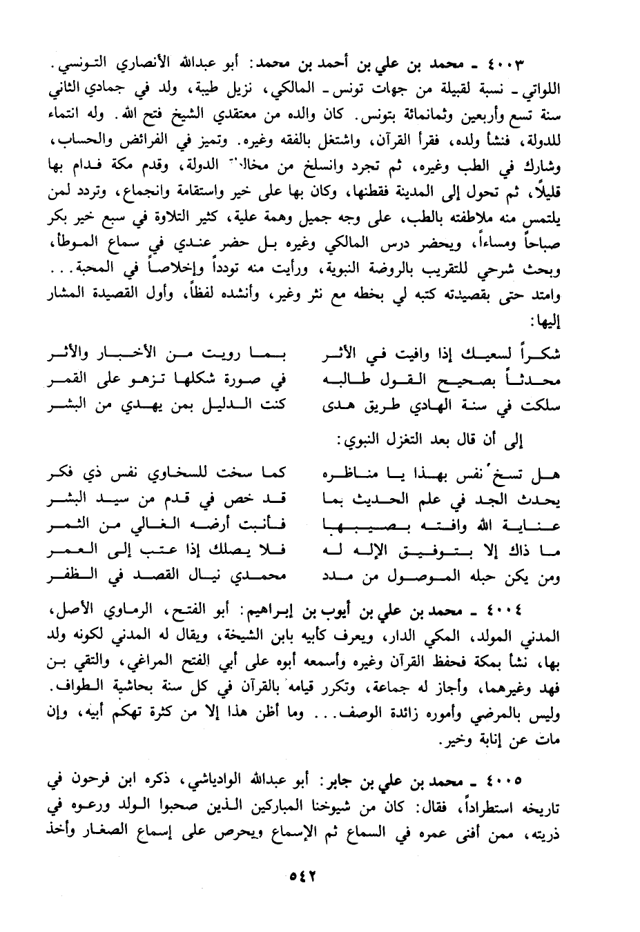4003 - محمد بن علي بن أحمد بن محمد: أبو عبد الله الأنصاري التونسي اللواتي - نسبة لقبيلة من جهات تونس - المالكي نزيل طيبة ولد في جمادي الثاني سنة تسع وأربعين وثمانمائة بتونس كان والده من معتقدي الشيخ فتح الله وله انتماء للدولة فنشأ ولده فقرأ القرآن واشتغل بالفقه وغيره وتميز في الفرائض والحساب وشارك في الطب وغيره ثم تجرد وانسلخ من مخالطة الدولة وقدم مكة فدام بها قليلا ثم تحول إلى المدينة فقطنها وكان بها على خير واستقامة وانجماع وتردد لمن يلتمس منه ملاطفته بالطب على وجه جميل وهمة علية كثير التلاوة في سبع خير بكر صباحا ومساءا ويحضر درس المالكي وغيره بل حضر عندي في سماع الموطأ وبحث شرحي للتقريب بالروضة النبوية ورأيت منه توددا وإخلاصا في المحبة وامتد حتى بقصيدته كتبه لي بخطه مع نثر وغير وأنشده لفظا واول القصيدة المشار إليها: