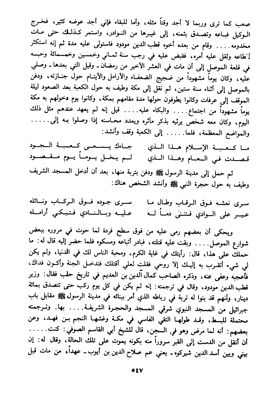 صعب كما ترى وربما لا أجد وقتا مثله وأما البقاء فإني أجد عوضه كثير فخرج الوكيل فباعه وتصدق بثمنه إلى غيرها من النوادر واستمر كذلك حتى مات مخدومه وقام من بعده أخوه قطب الدين مودود فاستولى عليه مدة ثم إنه استكثر إقطاعه وثقل عليه أمره فقبض عليه في رجب سنة ثماني وخمسين وخمسمائة وحبسه في قلعة الموصل إلى أن مات في العشر الأخير من رمضان - وقيل التي بعدها - وصلي عليه وكان يوما مشهودا من ضجيج الضعفاء والأرامل والأيتام حول جنازته ودفن بالموصل إلى أثناء سنة ستين ثم نقل إلى مكة وطيف به حول الكعبة بعد الصعود ليلة الموقف إلى عرفات وكانوا يطوفون حولها مدة مقامهم بمكة وكانوا يوم دخولهم به مكة يوما مشهودا من اجتماع والبكاء عليه قيل إنه لم يعهد عندهم مثل ذلك اليوم وكان معه شخص يرثيه بذكر مآثره ويعدد محاسنه إذا وصلوا به إلى والمواضع المعظمة فلما إلى الكعبة وقف وأنشد: