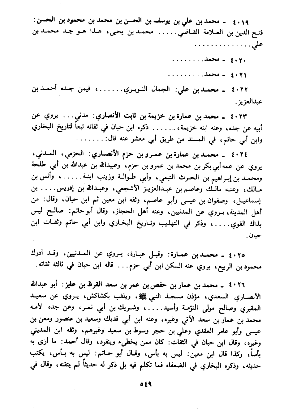 4025 - محمد بن عمارة: وقيل عبارة يروي عن المدنيين وقد أدرك محمود بن الربيع يروي عنه السكن ابن ابي حزم قاله ابن حبان في ثالثة ثقاته.