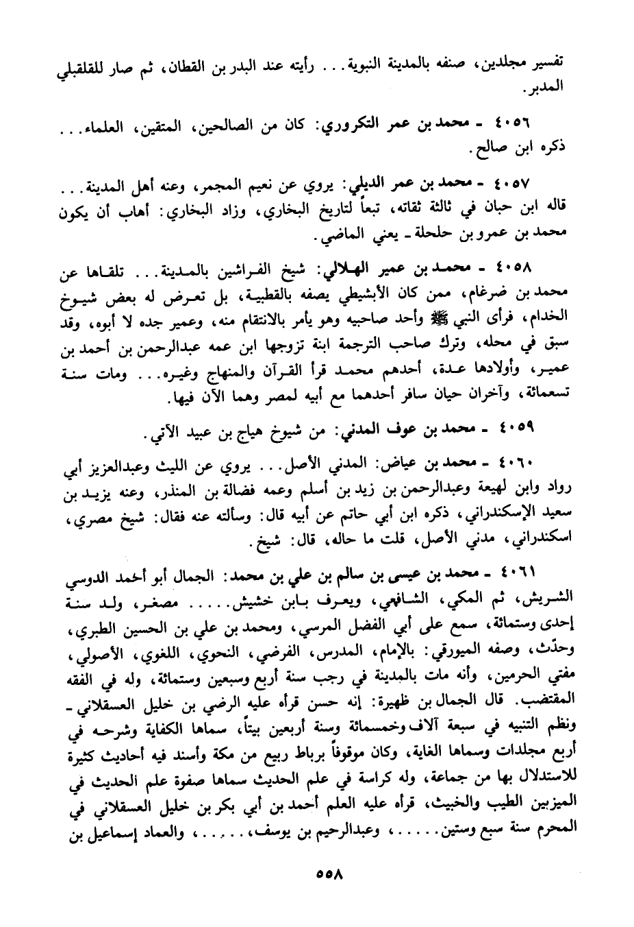 4058 - محمد بن عمير الهلالي: شيخ الفراشين بالمدينة تلقاها عن محمد بن ضرغام ممن كان الأبشيطي يصفه بالقطبية بل تعرض له بعض شيوخ الخدام فرأى النبي صلى الله عليه وسلم وأحد صاحبيه وهو يأمر بالانتقام منه وعمير جده لا أبوه وقد سبق في محله وترك صاحب الترجمة ابنة تزوجها ابن عمه عبد الرحمن بن أحمد بن عمير واولادها عدة أحدهم محمد قرأ القرآن والمنهاج وغيره ومات سنة تسعمائة وآخران حيان سافر أحدهما مع أبيه لمصر وهما الآن فيها.