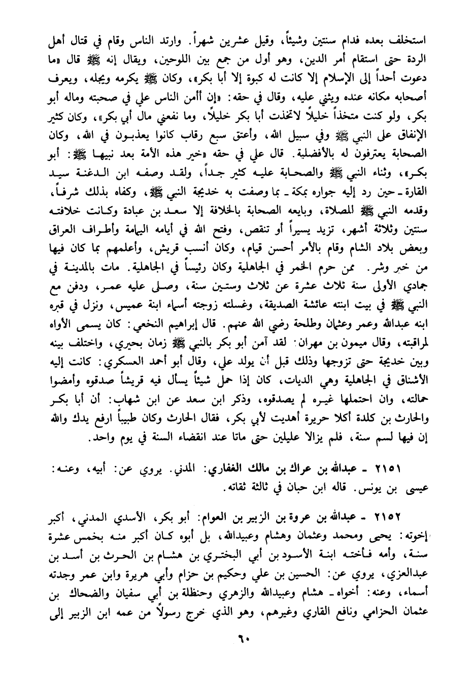2152 - عبد الله بن عروة بن الزبير بن العوام: أبو بكر الأسدي المدني أكبر إخوته: يحيى ومحمد وعثمان وهشام وعبيد الله بل أبوه كان أكبر منه بخمس عشرة سنة وأمه فأخته ابنة الأسود بن أبي البختري بن هشام بن الحرث بن أسد بن عبد العزي يروي عن: الحسين بن علي وحكيم بن حزام وأبي هريرة وابن عمر وجدته أسماء وعنه: أخواه - هشام وعبيد الله والزهري وحنظلة بن أبي سفيان والضحاك بن عثمان الحزامي ونافع القاري وغيرهم وهو الذي خرج رسولا من عمه ابن الزبير إلى