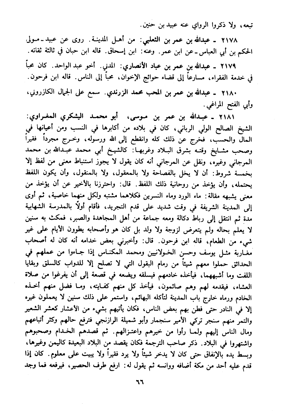 2179 - عبد الله بن عمر بن عباد الأنصاري: المدني أخو عبد الواحد كان محبا في خدمة الفقراء مسارعا إلى قضاء حوائج الإخوان محبا إلى الناس قاله ابن فرحون.
