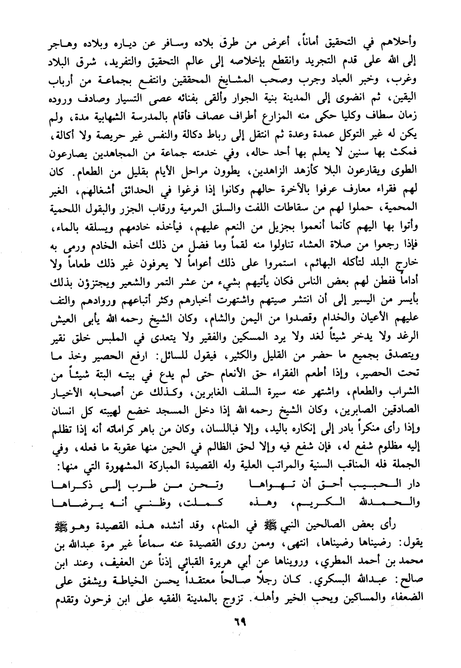 وأحلاهم في التحقيق أمانا أعرض من طرق بلاده وسافر عن دياره وبلاده وهاجر إلى الله على قدم التجريد وانقطع بإخلاصه إلى عالم التحقيق والتفريد, شرق البلاد وغرب وخبر العباد وجرب وصحب المشايخ المحققين وانتفع بجماعة من أرباب اليقين, ثم انضوى إلى المدينة بنية الجوار وألقى بفنائه عصى التسيار وصادف وروده زمان سطاف وكليا حكى منه المزارع أطراف عصام فأقام بالمدرسة الشهابية مدة ولم يكن له غير التوكل عمدة وعدة ثم انتقل إلى رباط دكالة والنفس غير حريصة ولا أكالة فمكث بها سنين لا يعلم بها أحد حاله وفي خدمته جماعة من المجاهدين يصارعون الطوى ويقارعون البلا كأزهد الزاهدين يطوون مراحل الأيام بقليل من الطعام. كان لهم فقراء معارف عرفوا بالآخرة حالهم وكانوا إذا فرغوا في الحدائق أشغالهم الغير المحمية, حملوا لهم من سقاطات اللفت والسلق المرمية ورقاب الجزر والبقول اللحمية وأتوا بها اليهم كأنما أنعموا بجزيل من النعم عليهم, فيأخذه خادمهم ويسلقه بالماء فإذا رجعوا من صلاة العشاء تناولوا منه لقما وما فضل من ذلك أخذه الخادم ورمى به خارج البلد لتأكله البهائم استمروا على ذلك أعواما لا يعرفون غير ذلك طعاما ولا أداما ففطن لهم بعض الناس فكان يأتيهم بشيء من عشر التمر والشعير ويجتزؤن بذلك بأيسر من اليسير إلى أن انتشر صيتهم واشتهرت أخبارهم وكثر أتباعهم وروادهم والتف عليهم الأعيان والخدام وقصدوا من اليمن والشام وكان الشيخ رحمه الله يأبى العيش الرغد ولا يدخر شيئا لغد ولا يرد المسكين والفقير ولا يتعدى في الملبس خلق نقير ويتصدق بجميع ما حضر من القليل والكثير فيقول للسائل: ارفع الحصير وخذ ما تحت الحصير وإذا أطعم الفقراء حق الأنعام حتى لم يدع في بيته البتة شيئا من الشراب والطعام واشتهر عنه سيرة السلف الغابرين وكذلك عن أصحابه الأخيار الصادقين الصابرين وكان الشيخ رحمه الله إذا دخل المسجد خضع لهيبته كل انسان وإذا رأى منكرا بادر إلى إنكاره باليد وإلا فباللسان وكان من باهركراماته أنه إذا تظلم إليه مظلوم شفع له فإن شفع فيه وإلا لحق الظالم في الحين منها عقوبة ما فعله, وفي الجملة فله المناقب السنية والمراتب العلية وله القصيدة المباركة المشهورة التي منها: