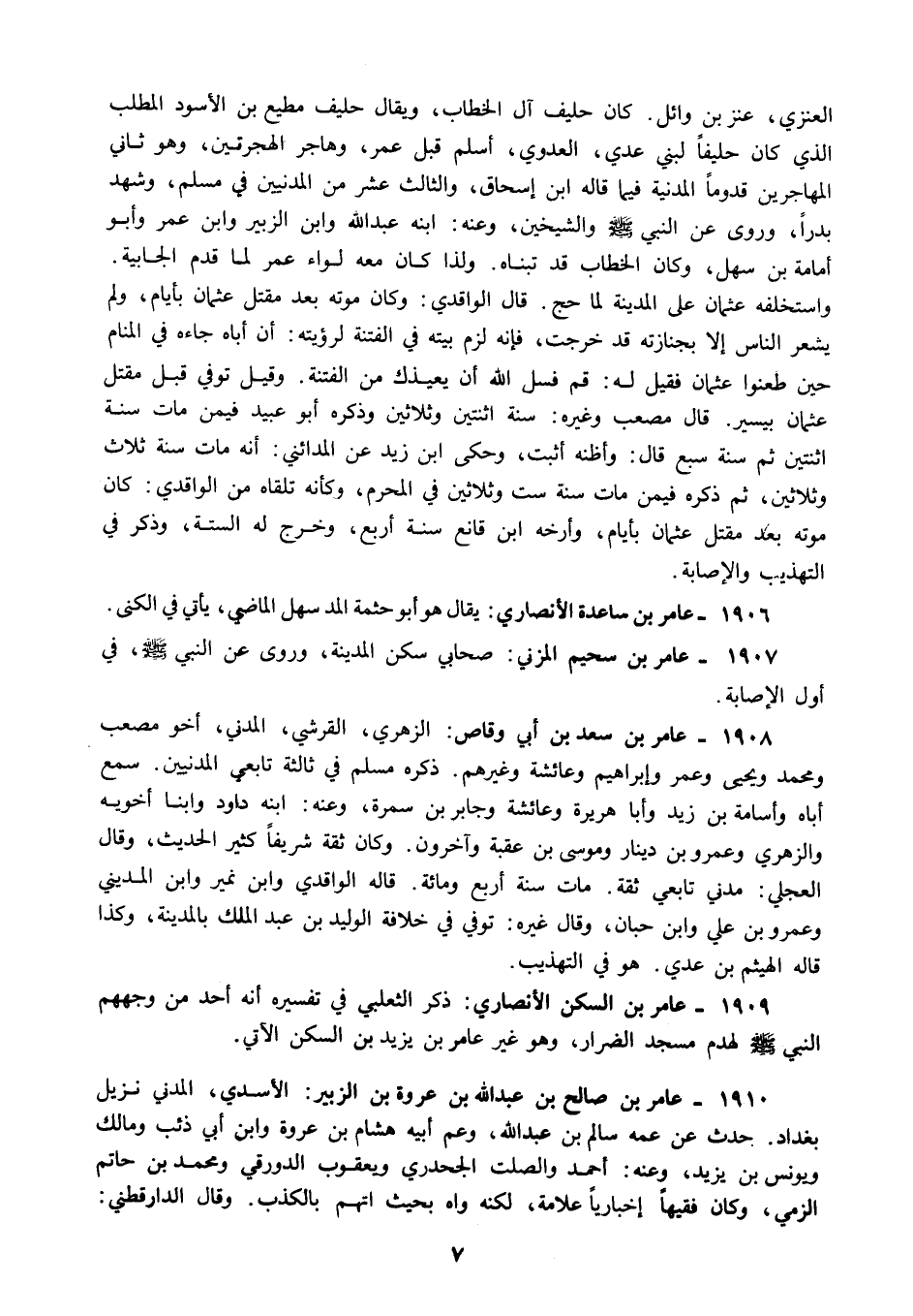 1908 - عامر بن سعد بن أبي وقاص: الزهري القرشي المدني أخو مصعب ومحمد ويحيى وعمر وإبراهيم وعائشة وغيرهم ذكره مسلم في ثالثة تابعي المدنيين سمع أباه وأسامة بن زيد وأبا هريرة وعائشة وجابر بن سمرة وعنه ابنه داود وابنا أخويه والزهري وعمرو بن دينار وموسى بن عقبة وآخرون وكان ثقة شريفا كثير الحديث وقال العجلي مدني تابعي ثقة مات سنة أربع ومائة قاله الواقدي وابن نمير وابن المديني وعمرو بن علي وابن حبان وقال غيره: توفي في خلافة الوليد بن عبد الملك بالمدينة وكذا قاله الهيثم بن عدي هو في التهذيب.