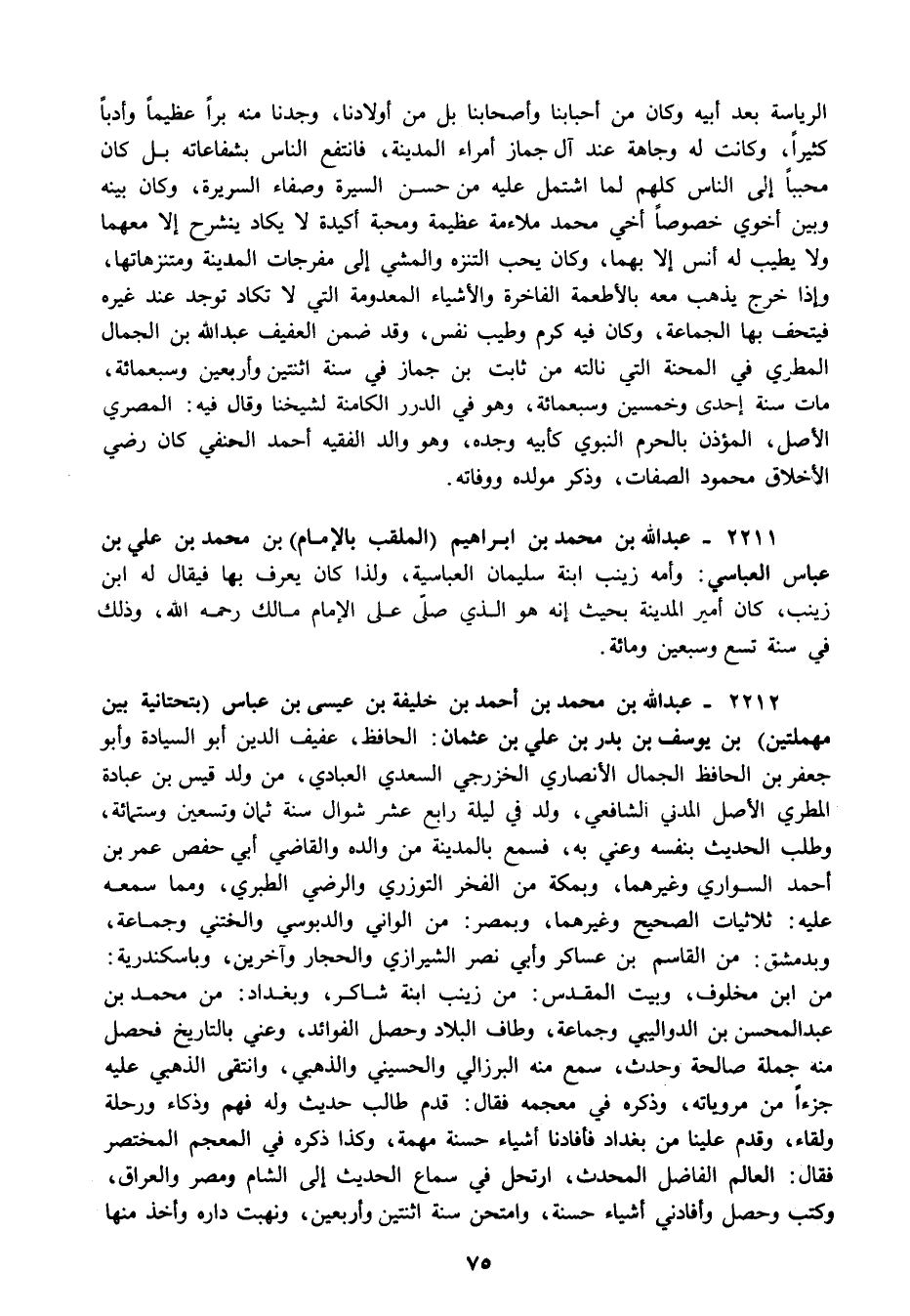 2211 - عبد الله بن محمد بن إبراهيم الملقب بالإمام بن محمد بن علي بن عباس العباسي: وأمه زينب ابنة سليمان العباسية ولذا كان يعرف بها فيقال له ابن زينب كان أمير المدينة بحيث إنه هو الذي صلى على الإمام مالك رحمه الله وذلك في سنة تسع وسبعين ومائة.