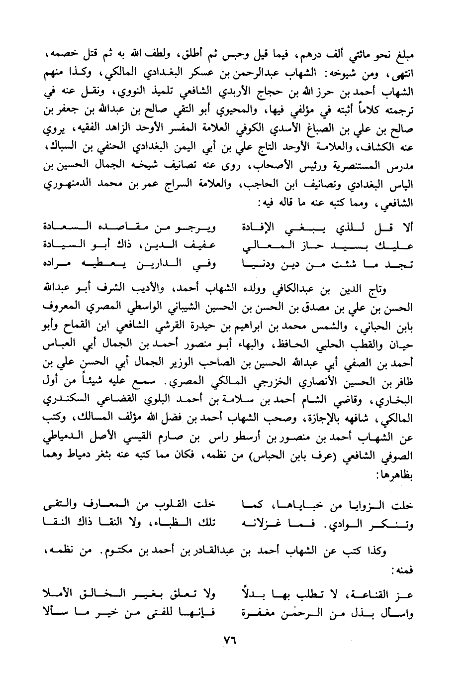 وكذا كتب عن الشهاب أحمد بن عبد القادر بن أحمد بن مكتوم من نظمه فمنه: