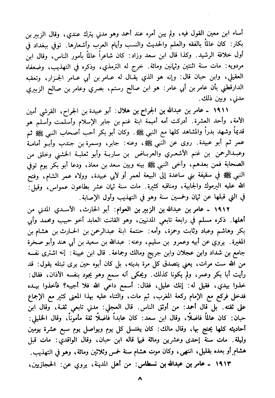 1912 - عامر بن عبد الله بن الزبير بن العوام: أبو الحارث الأسدي المدني من أهلها ذكره مسلم في رابعة تابعي المدنيين وهو القانت العابد أخو حبيب ومحمد وأبي بكر وهاشم وعباد وثابت وحمزة وأمه حنتمة ابنة عبد الرحمن بن الحارث بن هشام بن المغيرة يروي عن أبيه وعمرو بن سليم وعنه عبد الله بن سعيد بن أبي هند وأبو صخرة جامع بن شداد وابن عجلان وابن جريج ومالك وجماعة قال ابن عيينة إنه اشترى نفسه من الله ست مرات يعني يتصدق كل مرة بديته بل كان أبوه حين يرى تبتله يقول: قد رأيت أبا بكر وعمر ولم يكونا كذلك ويحكى أنه سمع وهو يجود بنفسه الأذان فقال خذوا بيدي فقيل له إنك عليل فقال أسمع داعي الله فلا أجيبه فأخذوا بيده فدخل فركع مع الإمام ركعة المغرب ثم مات والثناء عليه بهذا المعنى كثير مع الإجماع على ثقته بل قال أحمد: من أوثق الناس قال العجلي مدني تابعي ثقة وقال ابن حبان كان عالما فاضلا وقال ابن سعد كان عابدا فاضلا ثقة مأمونا وقال الخليلي أحاديثه كلها يحتج بها وقال مالك كان يغتسل كل يوم ويواصل يوم سبع عشرة يومين وليلة مات سنة إحدى وعشرين ومائة فيما قاله ابن حبان وقال الواقدي مات قبل هشام أو بعده بقليل انتهى وكان موت هشام سنة خمس وثلاثين ومائة وهو في التهذيب.