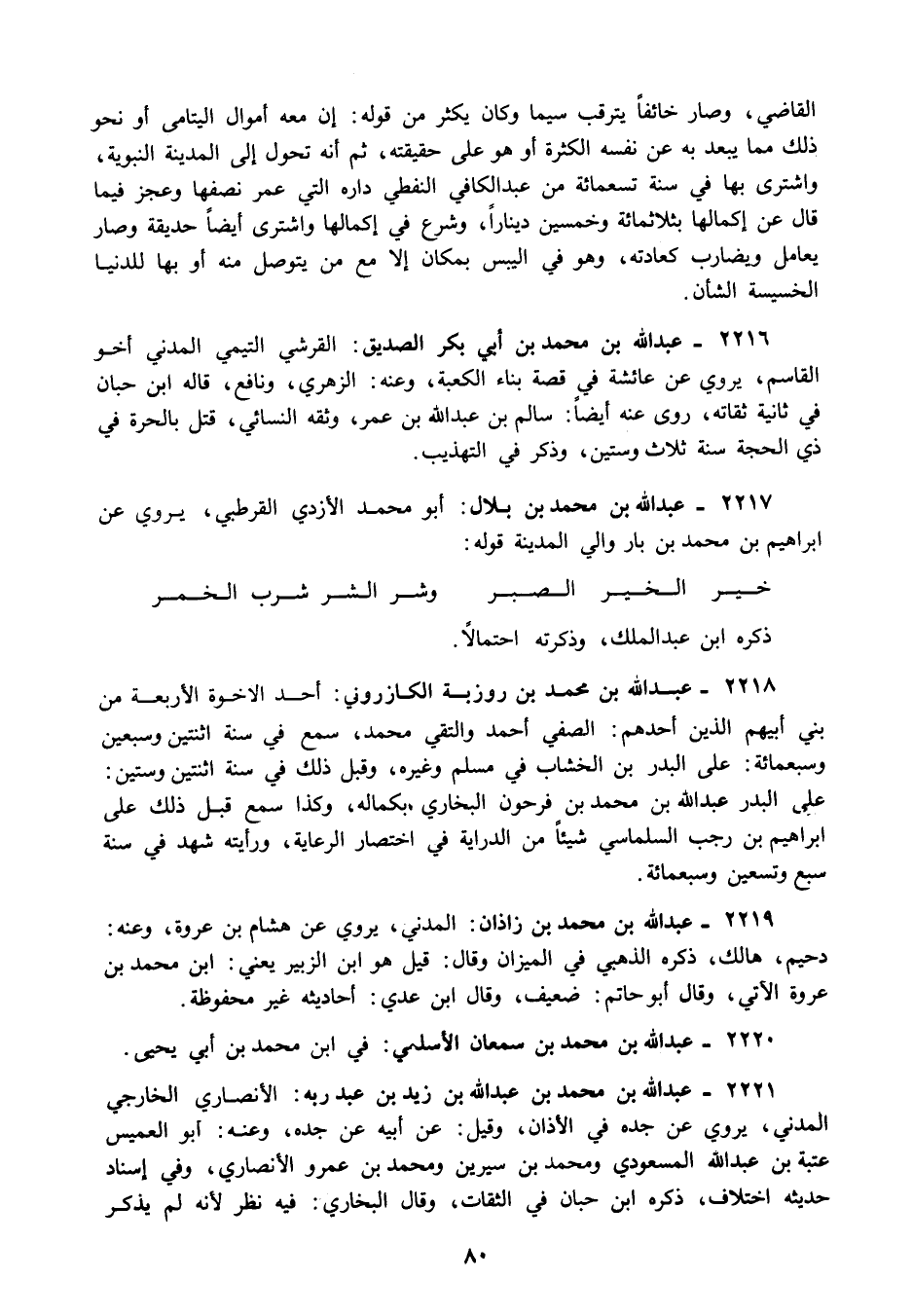 2217 - عبد الله بن محمد بن بلال: أبو محمد الأزدي القرطبي يروي عن إبراهيم بن محمد بن بار والي المدينة قوله:
