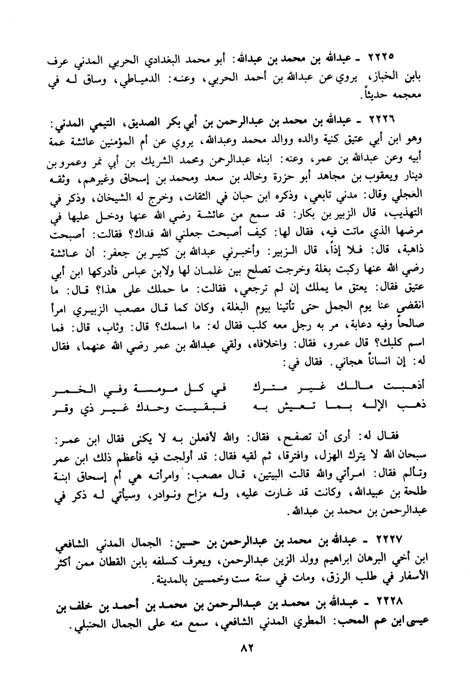 2225 - عبد الله بن محمد بن عبد الله: أبو محمد البغدادي الحربي المدني عرف بابن الخباز يروي عن عبد الله بن أحمد الحربي وعنه: الدمياطي وساق له في معجمه حديثا.