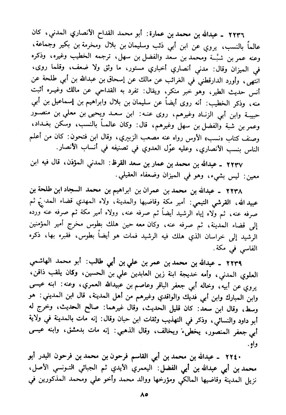 2239 - عبد الله بن محمد بن عمر بن علي بن أبي طالب: أبو محمد الهاشمي العلوي المدني وأمه خديجة ابنة زين العابدين علي بن الحسين وكان يلقب ذاقن يروي عن أبيه وخاله أبي جعفر الباقر وعاصم بن عبيد الله العمري وعنه: ابنه عيسى وابن المبارك وابن أبي فديك والواقدي وغيرهم من أهل المدينة قال ابن المديني هو وسط وقال ابن سعد: كان قليل الحديث وقال غيرهما: صالح الحديث وخرج له أبو داود والنسائي وذكر في التهذيب وثقات ابن حبان وقال: إنه مات بالمدينة في ولاية أبي جعفر المنصور يخطىء ويخالف وقال الذهبي: إنه مات بدمشق وابنه عيسى واه.