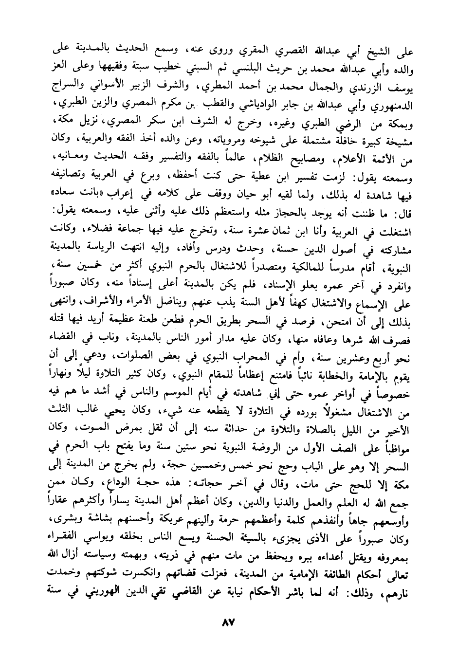 على الشيخ أبي عبد الله القصري المقري وروى عنه, وسمع الحديث بالمدينة على والده وأبي عبد الله محمد بن حريث البلنسي ثم السبتي خطيب سبتة وفقيهها وعلى العز يوسف الزرندي والجمال محمد بن أحمد المطري والشرف الزبير الأسواني والسراج الدمنهوري وأبي عبد الله بن جابر الوادياشي والقطب بن مكرم المصري والزين الطبري, وبمكة من الرضي الطبري وغيره وخرج له الشرف ابن سكر المصري نزل مكة مشيخة كبيرة حافلة مشتملة على شيوخه ومروياته وعن والده أخذ الفقه والعربية, وكان من الأئمة الأعلام ومصابيح الظلام عالما بالفقه والتفسير وفقه الحديث ومعانيه وسمعته يقول: لزمت تفسير ابن عطية حتى كنت أحفظه وبرع في العربية وتصانيفه فيها شاهدة له بذلك, ولما لقيه أبو حيان ووقف على كلامه في إعراب "بانت سعاد" قال: ما ظننت أنه يوجد بالحجاز مثله واستعظم ذلك عليه وأثنى عليه, وسمعته يقول: اشتغلت في العربية وأنا ابن ثمان عشرة سنة وتخرج عليه فيها جماعة فضلاء وكانت مشاركته في أصول الدين حسنة وحدث ودرس وأفاد وإليه انتهت الرياسة بالمدينة النبوية, أقام مدرسا للمالكية ومتصدرا للاشتغال بالحرم النبوي أكثر من خمسين سنة وانفرد في آخر عمره بعلو الإسناد فلم يكن بالمدينة أعلى إسنادا منه, وكان صبورا على الإسماع والاشغال كهفا لأهل السنة يذب عنهم ويناضل الأمراء والأشراف وانتهى بذلك إلى أن امتحن, فرصد في السحر بطريق الحرم فطعن طعنة عظيمة اريد فيها قتله فصرف الله شرها وعافاه منها وكان عليه مدار أمور الناس بالمدينة وناب في القضاء نحو أربع وعشرين سنة وأم في المحراب النبوي في بعض الصلوات, ودعي إلى أن يقوم بالإمامة والخطابة نائبا فامتنع إعظاما للمقام النبوي وكان كثير التلاوة ليلا ونهارا خصوصا في أواخر عمره حتى إني شاهدته في أيام الموسم والناس في أشد ما هم فيه من الاشتغال مشغولا بورده في التلاوة لا يقطعه عنه شيء وكان يحيي غالب الثلث الأخير من الليل بالصلاة والتلاوة من حداثة سنة إلى أن ثقل بمرض الموت وكان مواظبا عل الصف الأول من الروضة النبوية نحو ستين سنة وما يفتح باب الحرم في السحر إلا وهو على الباب وحج نحو خمس وخمسين حجة ولم يخرج من المدينة إلى مكة إلا للحج حتى مات وقال في آخر حجاته: هذه حجة الوداع وكان ممن جمع الله له العلم والعمل والدنيا والدين وكان أعظم أهل المدينة يسارا وأكثرهم عقارا وأوسعهم جاها وأنفذهم كلمة وأعظمهم حرمة وألينهم عريكة وأحسنهم بشاشة وبشرى وكان صبورا على الأذى يجزىء بالسيئة الحسنة ويسع الناس بخلقه ويواسي الفقراء بمعروفه ويقتل أعداءه ببره ويحفظ من مات منهم في ذريته وبهمته وسياسته أزال الله تعالى أحكام الطائفة الإمامية من المدينة فعزلت قضاتهم وانكسرت شوكتهم وخمدت نارهم وذلك: أنه لما باشر الأحكام نيابة عن القاضي تقي الدين الهوريني في سنة