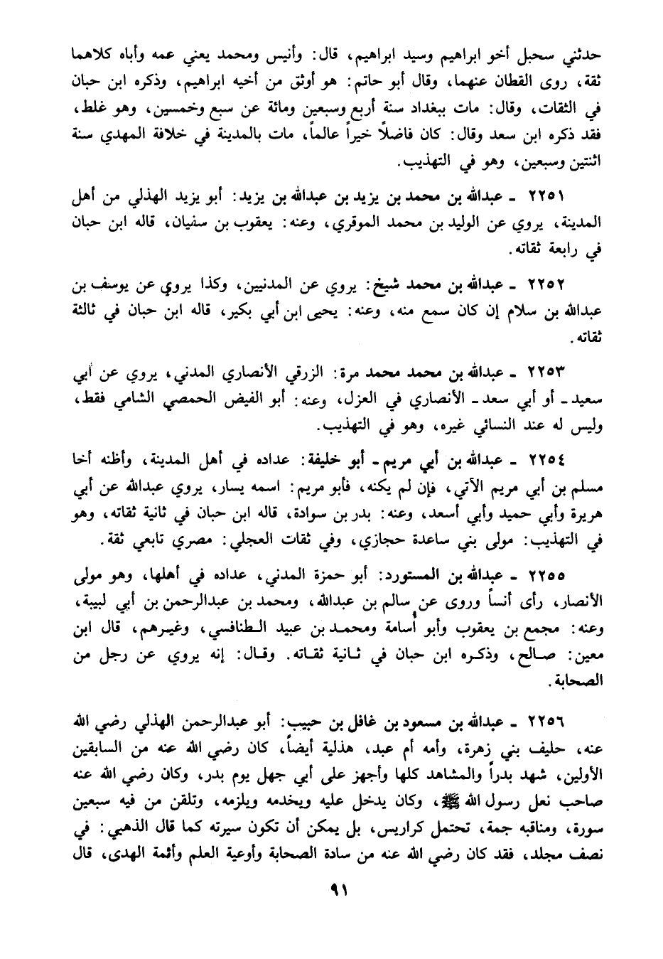 2251 - عبد الله بن محمد بن يزيد بن عبد الله بن يزيد: أبو يزيد الهذلي من أهل المدينة يروي عن الوليد بن محمد الموقري وعنه يعقوب بن سفيان قاله ابن حبان في رابعة ثقاته.