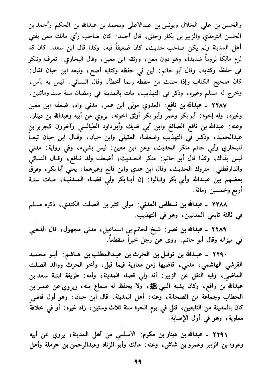 2289 - عبد الله بن نصر: شيخ لحاتم بن إسماعيل مدني مجهول قال الذهبي في ميزانه وقال أبو حاتم: روى عن رجل خبرا منقطعا.
