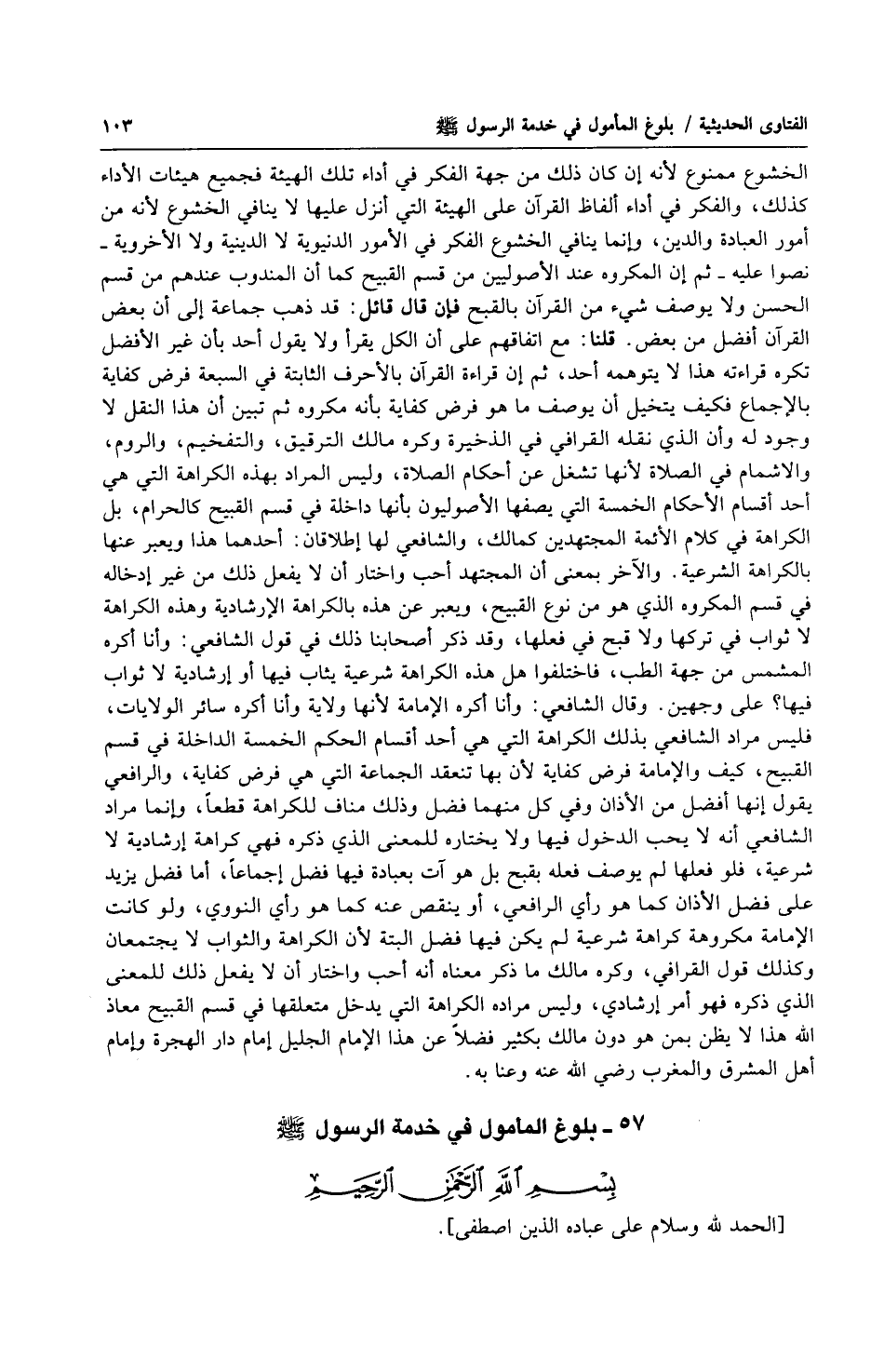 الخشوع ممنوع لأنه إن كان ذلك من جهة الفكر في أداء تلك الهيئة فجميع هيئات الأداء كذلك، والفكر في أداء ألفاظ القرآن على الهيئة التي أنزل عليها لا ينافي الخشوع لأنه من أمور العبادة والدين، وإنما ينافي الخشوع الفكر في الأمور الدنيوية لا الدينية ولا الأخروية نصوا عليه ثم إن المكروه عند الأصوليين من قسم القبيح كما أن المندوب عندهم من قسم الحسن ولا يوصف شيء من القرآن بالقبح) فإن قال قائل (: قد ذهب جماعة إلى أن بعض القرآن أفضل من بعض. قلنا: مع اتفاقهم على أن الكل يقرأ ولا يقول أحد بأن غير الأفضل تكره قراءته هذا لا يتوهمه أحد، ثم إن قراءة القرآن بالأحرف الثابتة في السبعة فرض كفاية بالإجماع فكيف يتخيل أن يوصف ما هو فرض كفاية بأنه مكروه ثم تبين أن هذا النقل لا وجود له وأن الذي نقله القرافي في الذخيرة وكره مالك الترقيق، والتفخيم، والروم، والاشمام في الصلاة لأنها تشغل عن أحكام الصلاة، وليس المراد بهذه الكراهة التي هي أحد أقسام الأحكام الخمسة التي يصفها الأصوليون بأنها داخلة في قسم القبيح كالحرام، بل الكراهة في كلام الأئمة المجتهدين كمالك، والشافعي لها إطلاقان: أحدهما هذا ويعبر عنها بالكراهة الشرعية. والآخر بمعنى أن المجتهد أحب واختار أن لا يفعل ذلك من غير إدخاله في قسم المكروه الذي هو من نوع القبيح، ويعبر عن هذه بالكراهة الإرشادية وهذه الكراهة لا ثواب في تركها ولا قبح في فعلها، وقد ذكر أصحابنا ذلك في قول الشافعي: وأنا أكره المشمس من جهة الطب، فاختلفوا هل هذه الكراهة شرعية يثاب فيها أو إرشادية لا ثواب فيها؟ على وجهين. وقال الشافعي: وأنا أكره الإمامة لأنها ولاية وأنا أكره سائر الولايات، فليس مراد الشافعي بذلك الكراهة التي هي أحد أقسام الحكم الخمسة الداخلة في قسم القبيح، كيف والإمامة فرض كفاية لأن بها تنعقد الجماعة التي هي فرض كفاية، والرافعي يقول إنها أفضل من الأذان وفي كل منهما فضل وذلك مناف للكراهة قطعاً، وإنما مراد الشافعي أنه لا يحب الدخول فيها ولا يختاره للمعنى الذي ذكره فهي كراهة إرشادية لا شرعية، فلو فعلها لم يوصف فعله بقبح بل هو آت بعبادة فيها فضل إجماعاً، إما فضل يزيد على فضل الأذان كما هو رأي الرافعي، أو ينقص عنه كما هو رأي النووي، ولو كانت الإمامة مكروهة كراهة شرعية لم يكن فيها فضل البتة لأن الكراهة والثواب لا يجتمعان وكذلك قول القرافي، وكره مالك ما ذكر معناه أنه أحب واختار أن لا يفعل ذلك للمعنى الذي ذكره فهو أمر إرشادي، وليس مراده الكراهة التي يدخل متعلقها في قسم القبيح معاذ الله هذا لا يظن بمن هو دون مالك بكثير فضلاً عن هذا الإمام الجليل إمام دار الهجرة وإمام أهل المشرق والمغرب رضي الله عنه وعنا به.