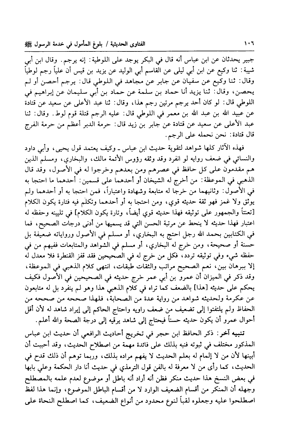 تنبيه آخر: ذكر الحافظ ابن حجر في تخريج أحاديث الرافعي أن حديث ابن عباس المذكور مختلف في ثبوته فنبه بذلك على فائدة مهمة من اصطلاح الحديث، وقد أحببت أن أبينها لأن من لا إلمام له بعلم الحديث لا يفهم مراده بذلك، وربما توهم أن ذلك قدح في الحديث، كما رأى من لا معرفة له بالفن قول الترمذي في حديث أنا دار الحكمة وعلي بابها في بعض النسخ هذا حديث منكر فظن أنه أراد أنه باطل أو موضوع لعدم علمه بالمصطلح وجهله أن المنكر من أقسام الضعيف الوارد لا من أقسام الباطل الموضوع، وإنما هذا لفظ اصطلحوا عليه وجعلوه لقباً لنوع محدود من أنواع الضعيف، كما اصطلح النحاة على