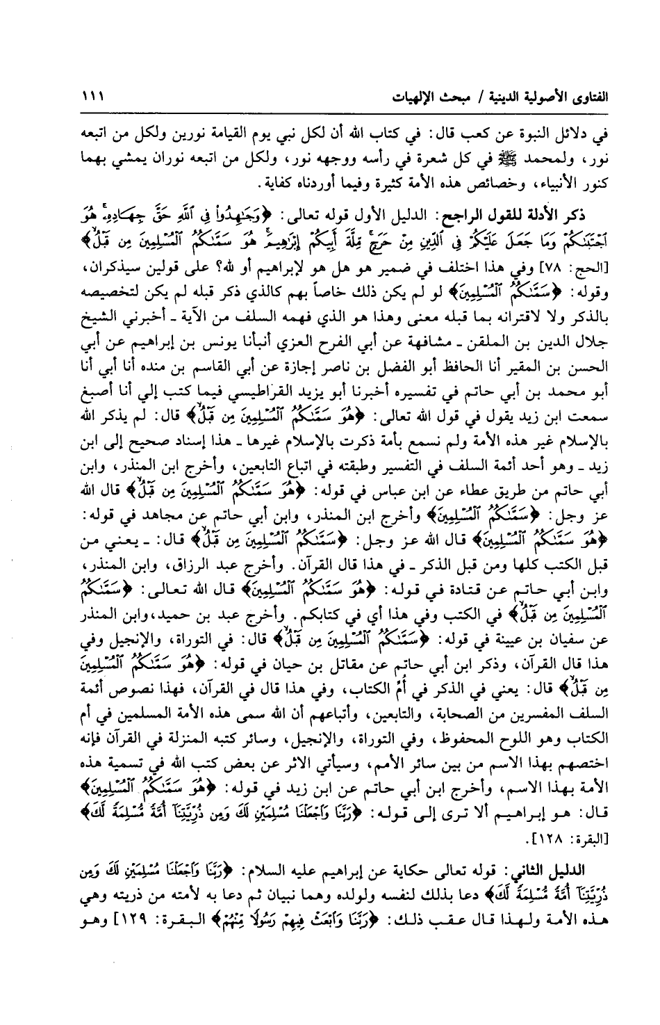 ذكر الأدلة للقول الراجح: الدليل الأول قوله تعالى:) وجاهدوا في الله حق جهاده هو اجتباكم وما جعل عليكم في الدين من حرج ملة أبيكم إبراهيم هو سماكم المسلمين من قبل (وفي هذا اختلف في ضمير هو هل هو لإبراهيم أو لله؟ على قولين سيذكران، وقوله:) سماكم المسلمين (لو لم يكن ذلك خاصاً بهم كالذي ذكر قبله لم يكن لتخصيصه بالذكر ولا لاقترانه بما قبله معنى وهذا هو الذي فهمه السلف من الآية أخبرني الشيخ جلال الدين بن الملقن مشافهة عن أبي الفرح العزي أنبأنا يونس بن إبراهيم عن أبي الحسن بن المقير أنا الحافظ أبو الفضل بن ناصر إجازة عن أبي القاسم ابن منده أنا أبي أنا أبو محمد بن أبي حاتم في تفسيره أخبرنا أبو يزيد القراطيسي فيما كتب إلي أنا أصبغ سمعت ابن زيد يقول في قول الله تعالى:) هو سماكم المسلمين من قبل (قال: لم يذكر الله بالإسلام غير هذه الأمة ولم نسمع بأمة ذكرت بالإسلام غيرها هذا إسناد صحيح إلى ابن زيد وهو أحد أئمة السلف في التفسير وطبقته في اتباع التابعين، وأخرج ابن المنذر، وابن أبي حاتم من طريق عطاء عن ابن عباس في قوله:) هو سماكم المسلمين من قبل (قال الله عز وجل:) سماكم المسلمين (وأخرج ابن المنذر، وابن أبي حاتم عن مجاهد في قوله:) هو سماكم المسلمين (قال الله عز وجل:) سماكم من قبل (قال: يعني من قبل الكتب كلها ومن قبل الذكر في هذا قال القرآن. وأخرج عبد الرزاق، وابن المنذر، وابن أبي حاتم عن قتادة في قوله:) هو سماكم المسلمين (قال الله تعالى: سماكم المسلمين من قبل في الكتب وفي هذا أي في كتابكم. وأخرج عبد بن حميد، وابن المنذر عن سفيان بن عيينة في قوله:) هو سماكم المسلمين من قبل (قال: في التوراة، والإنجيل وفي هذا قال القرآن، وذكر ابن أبي حاتم عن مقاتل بن حيان في قوله:) هو سماكم المسلمين من قبل (قال: يعني في الذكر في أُمِّ الكتاب، وفي هذا قال في القرآن، فهذا نصوص أئمة السلف المفسرين من الصحابة، والتابعين، وأتباعهم أن الله سمى هذه الأمة المسلمين في أم الكتاب وهو اللوح المحفوظ، وفي التوراة، والإنجيل، وسائر كتبه المنزلة في القرآن فإنه اختصهم بهذا الاسم من بين سائر الأمم، وسيأتي الاثر عن بعض كتب الله في تسمية هذه الأمة بهذا الاسم، وأخرج ابن أبي حاتم عن ابن زيد في قوله:) هو سماكم المسلمين (قال: هو إبراهيم ألا ترى إلى قوله:) ربنا واجعلنا مسلمة لك ومن ذريتنا أمة مسلمة لك (.