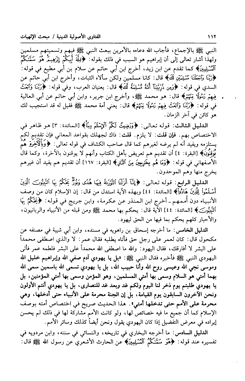 الدليل الخامس : ما أخرجه إسحاق بن راهويه في مسنده ، وابن أبي شيبة في مصنفه عن مكحول قال : كان لعمر على رجل حق فأتاه يطلبه فقال عمر : لا والذي اصطفى محمداً على البشر لا أفارقك ، فقال اليهود : والله ما اصطفى الله محمداً على البشر فلطمه عمر فأتى اليهودي النبي صلى الله عليه وسلّم فأخبره فقال النبي صلى الله عليه وسلّم : ( بل يا يهودي آدم صفي الله وإبراهيم خليل الله وموسى نجي الله وعيسى روح الله وأنا حبيب الله ، بل يا يهودي تسمى الله باسمين سمى الله بهما أمتي هو السلام وسمى بها أمتي المسلمين ، وهو المؤمن وسمى بها أمتي المؤمنين ، بل يا يهودي طلبتم يوم ذخر لنا لنا اليوم ولكم غد وبعد غد للنصارى ، بل يا يهودي أنتم الأولون ونحن الآخرون السابقون يوم القيامة ، بل إن الجنة محرمة على الأنبياء حتى أدخلها ، وهي محرمة على الأمم حتى تدخلها أمتي ). هذا الحديث صريح في اختصاص أمته بوصف الإسلام كما أن جميع ما فيه خصائص لها ، ولو كانت الأمم مشاركة لها في ذلك لم يحسن إيراده في معرض التفضيل إذا كان اليهودي يقول ونحن أيضاً كذلك وسائر الأمم.